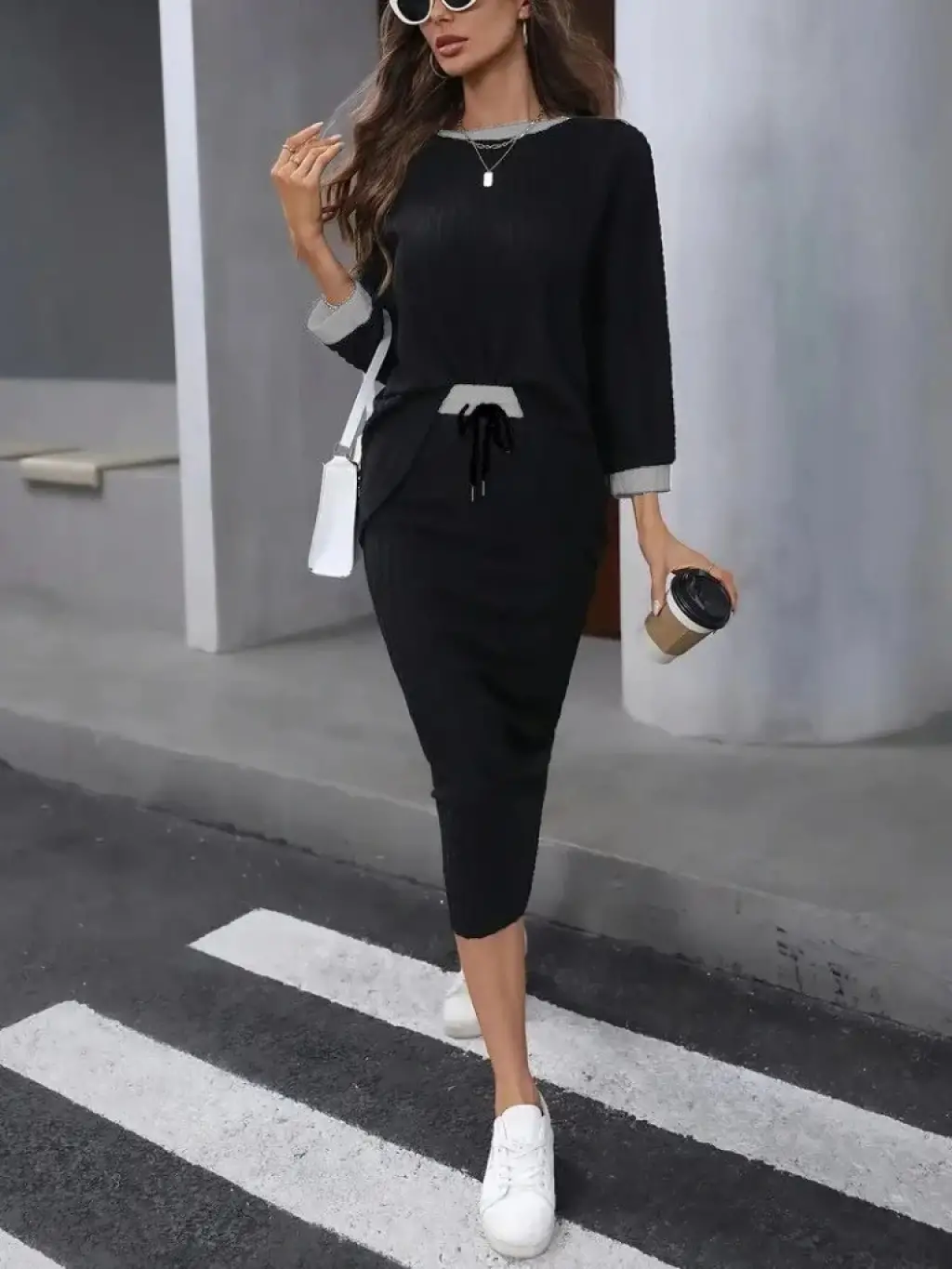 Kadın Uzun Kollu Yakası Açık Yarasa Kollu şardonlu Kaşkorse Bluz Ve Etek Takım