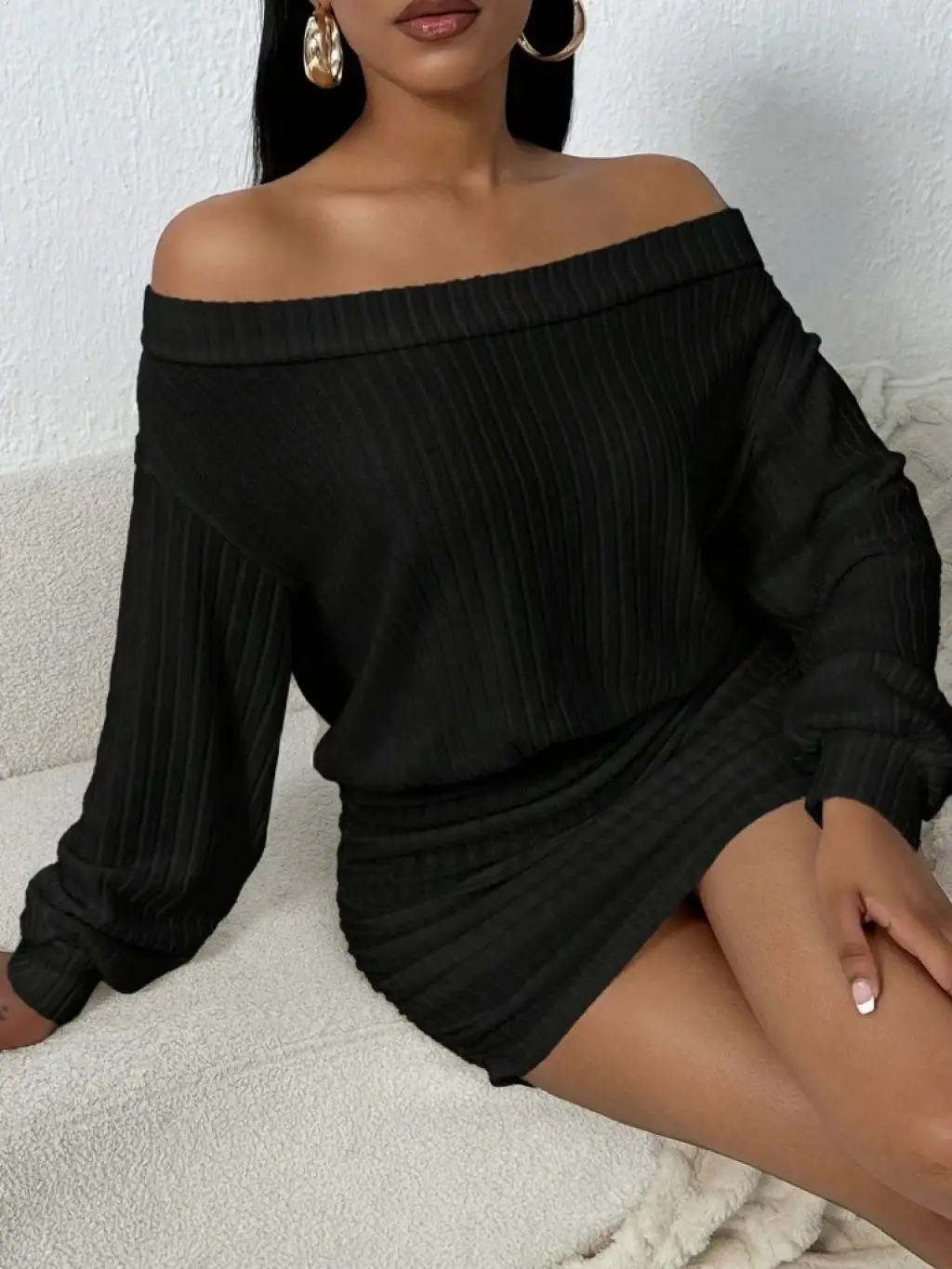 Kadın Uzun Kollu Geniş Yaka Yırtmaç Detay Mini Boy Triko Elbise