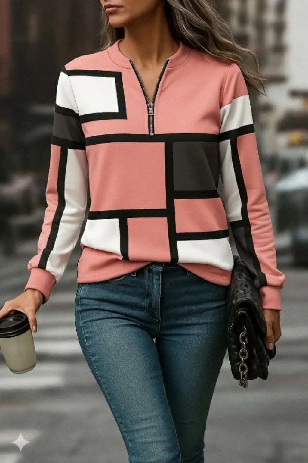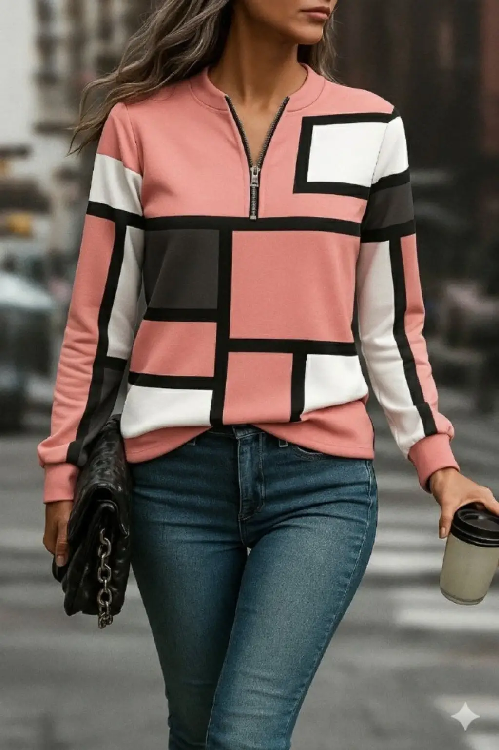 Kadın Uzun Kollu Yakadan Fermuarlı Desenli şardonlu Dalgıç Bluz