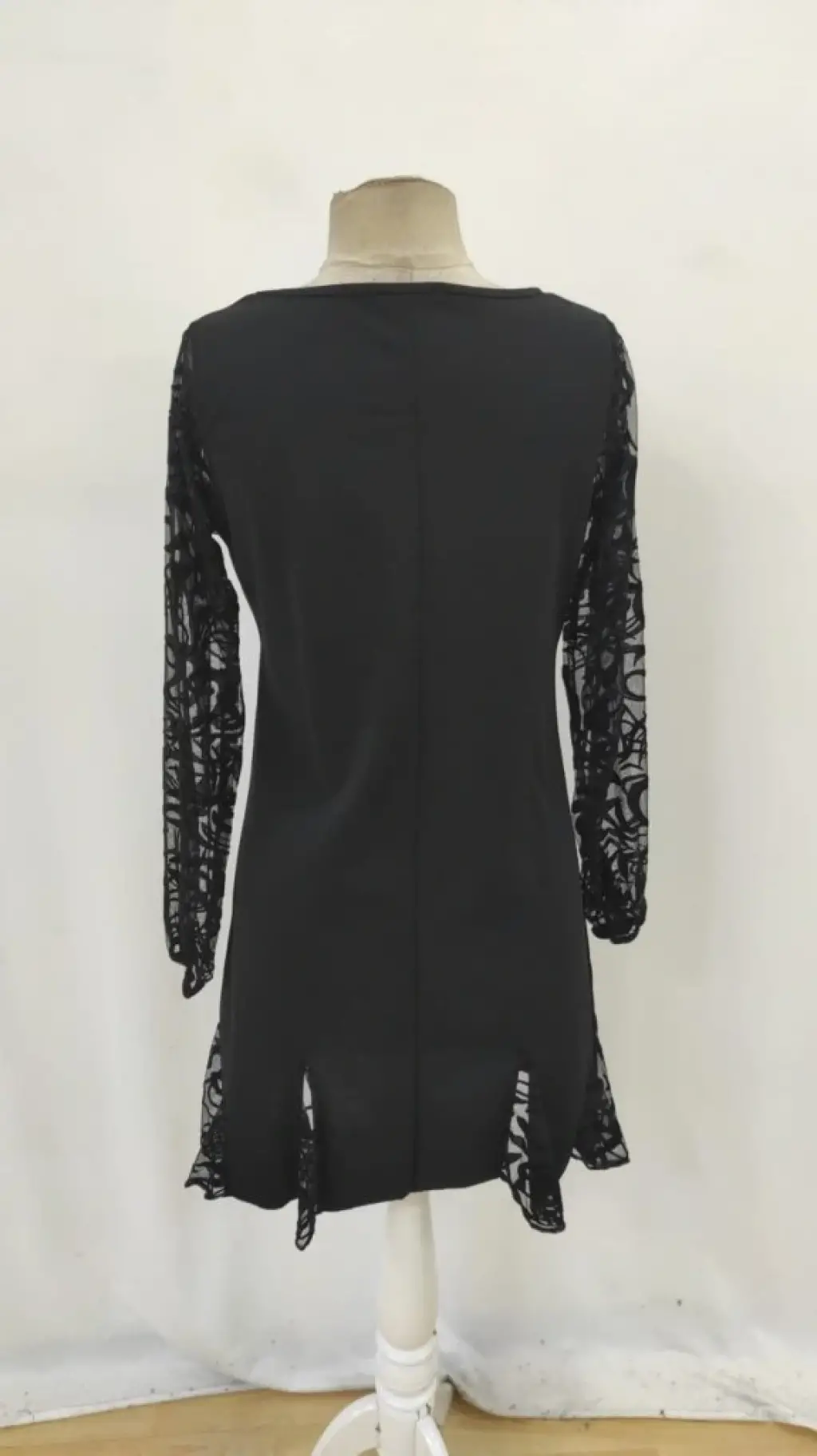 Kadın Uzun Kollu Yuvarlak Yaka Kol Ve Etek Ucu Dantelli Kısa Ithal Krep Elbise