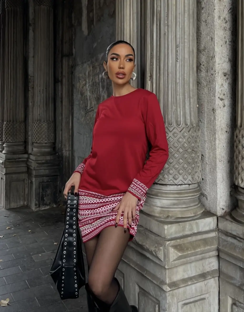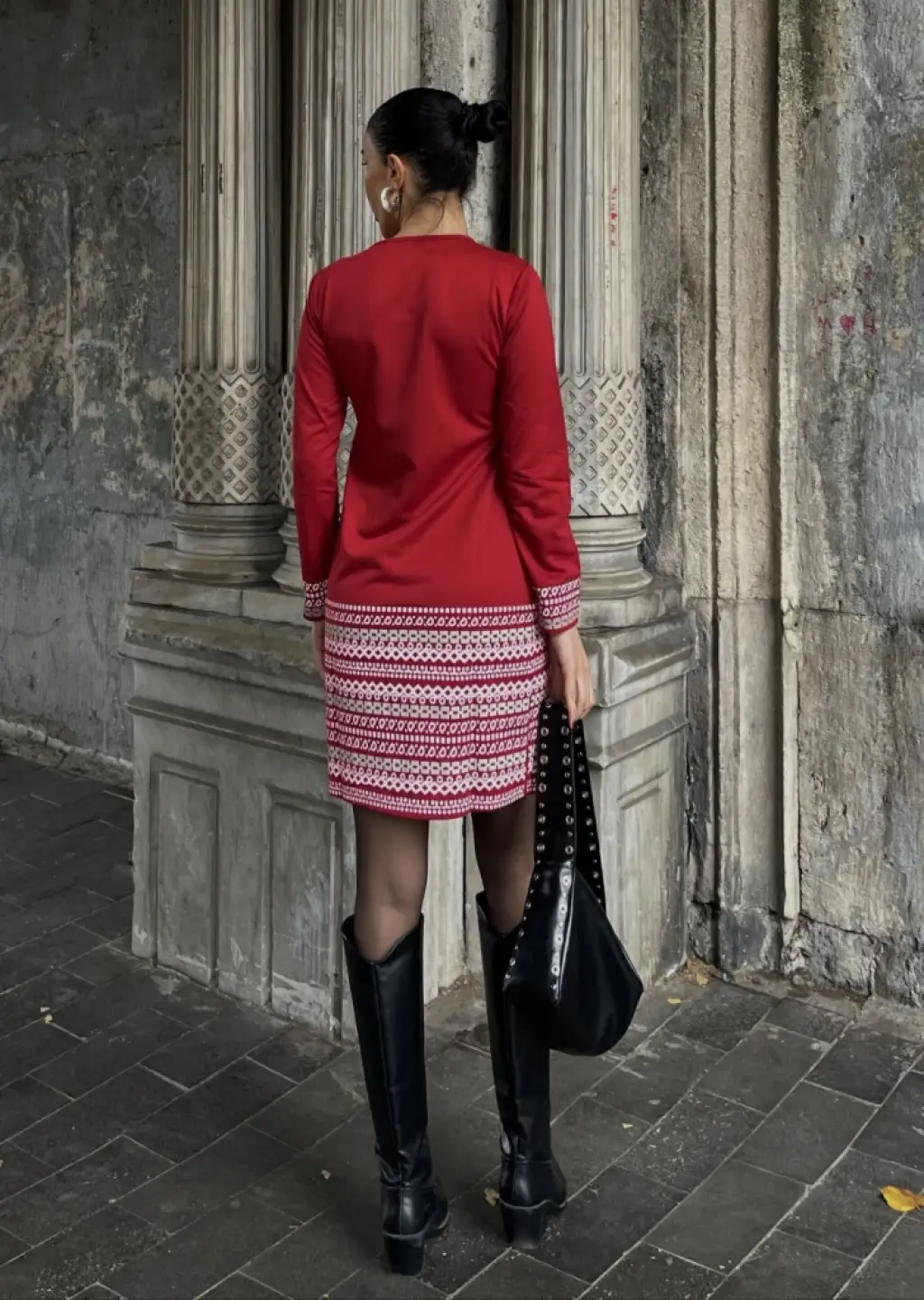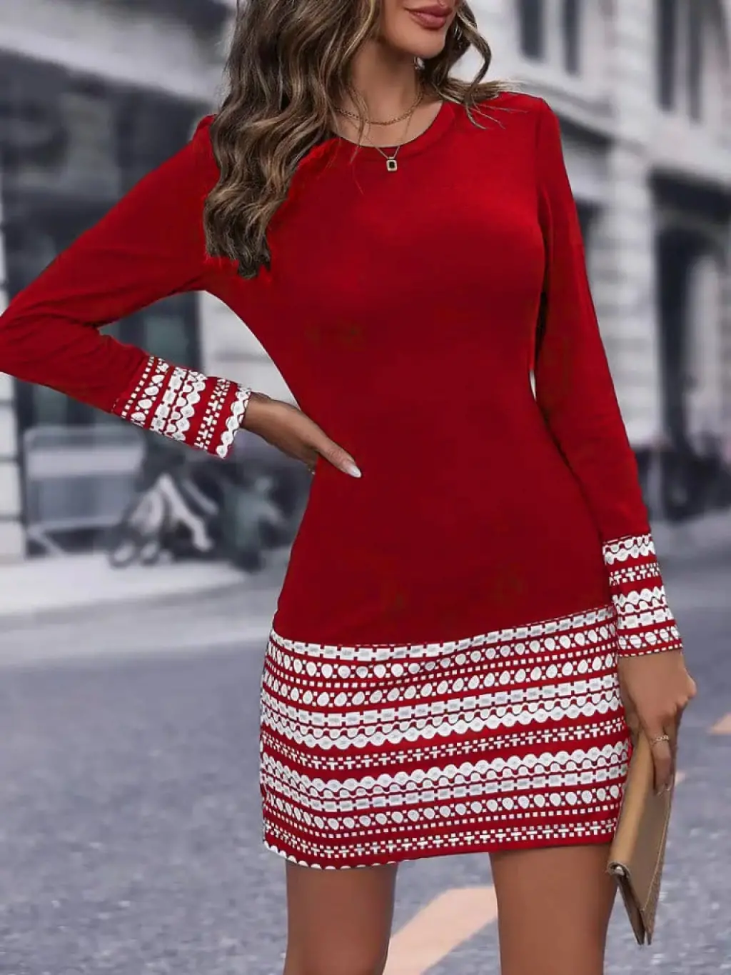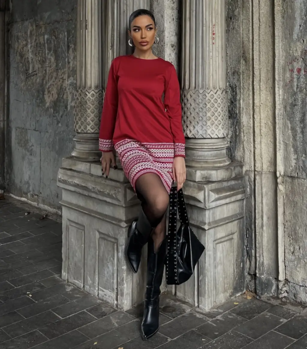 Kadın Uzun Kollu Bisiklet Yaka Kol Ağzı Ve Etek Ucu Baskılı Iki Iplik Elbise