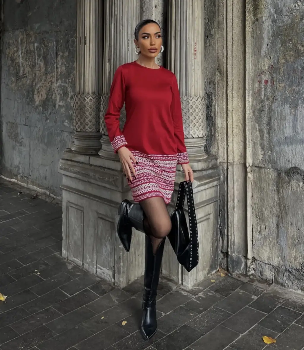 Kadın Uzun Kollu Balıkçı Yaka Belden Bağlamalı üst Kaşkorse Eteği Dalgıç Elbise