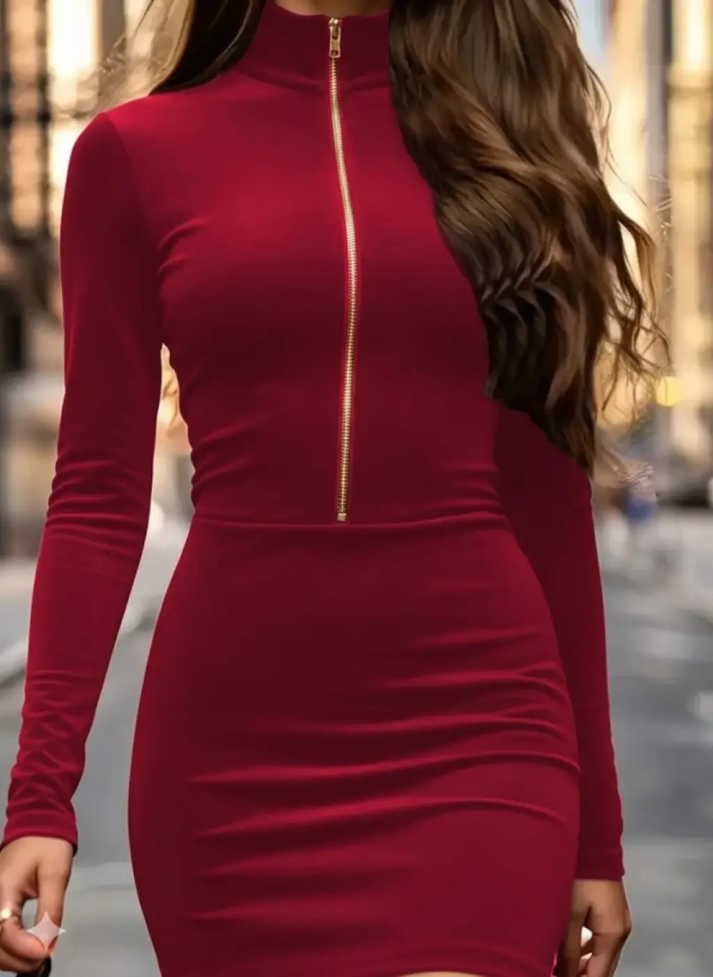 Kadın Uzun Kollu Balıkçı Yaka Yakadan Göğüse Kadar Fermuar Detaylı Mini Kadife Elbise