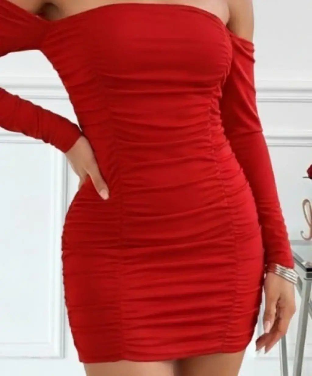 Kadın Uzun Kollu Omuzlardan Açık Takma Kollu Büzgülü Sandy Kısa Elbise