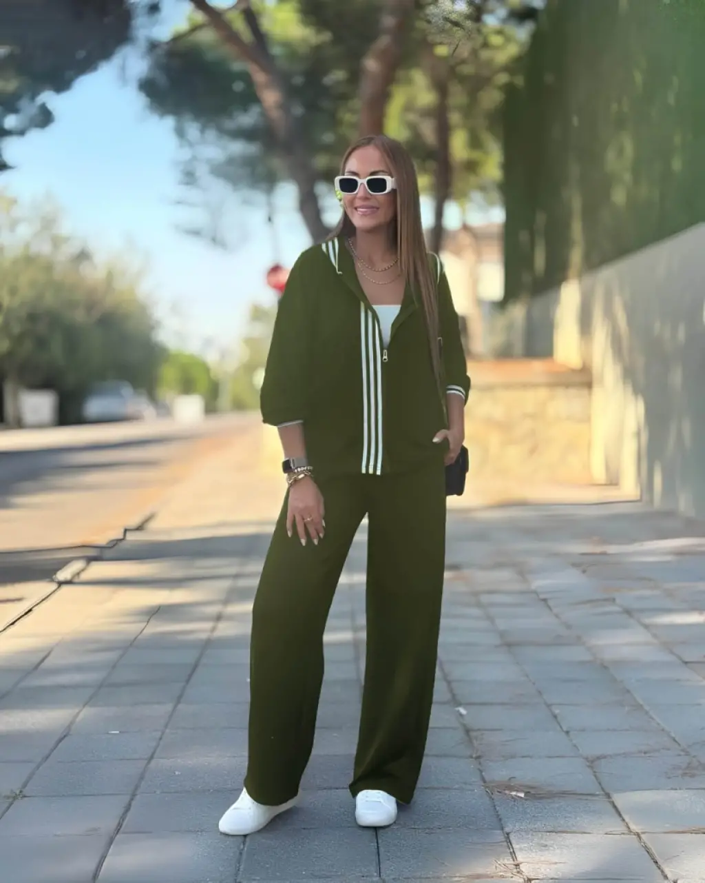 Kadın Uzun Kollu Kapşonlu Onu şerit Detaylı Fermuarlı Viskon Iki Iplik Bluz Ve Pantolon Ikili Takım