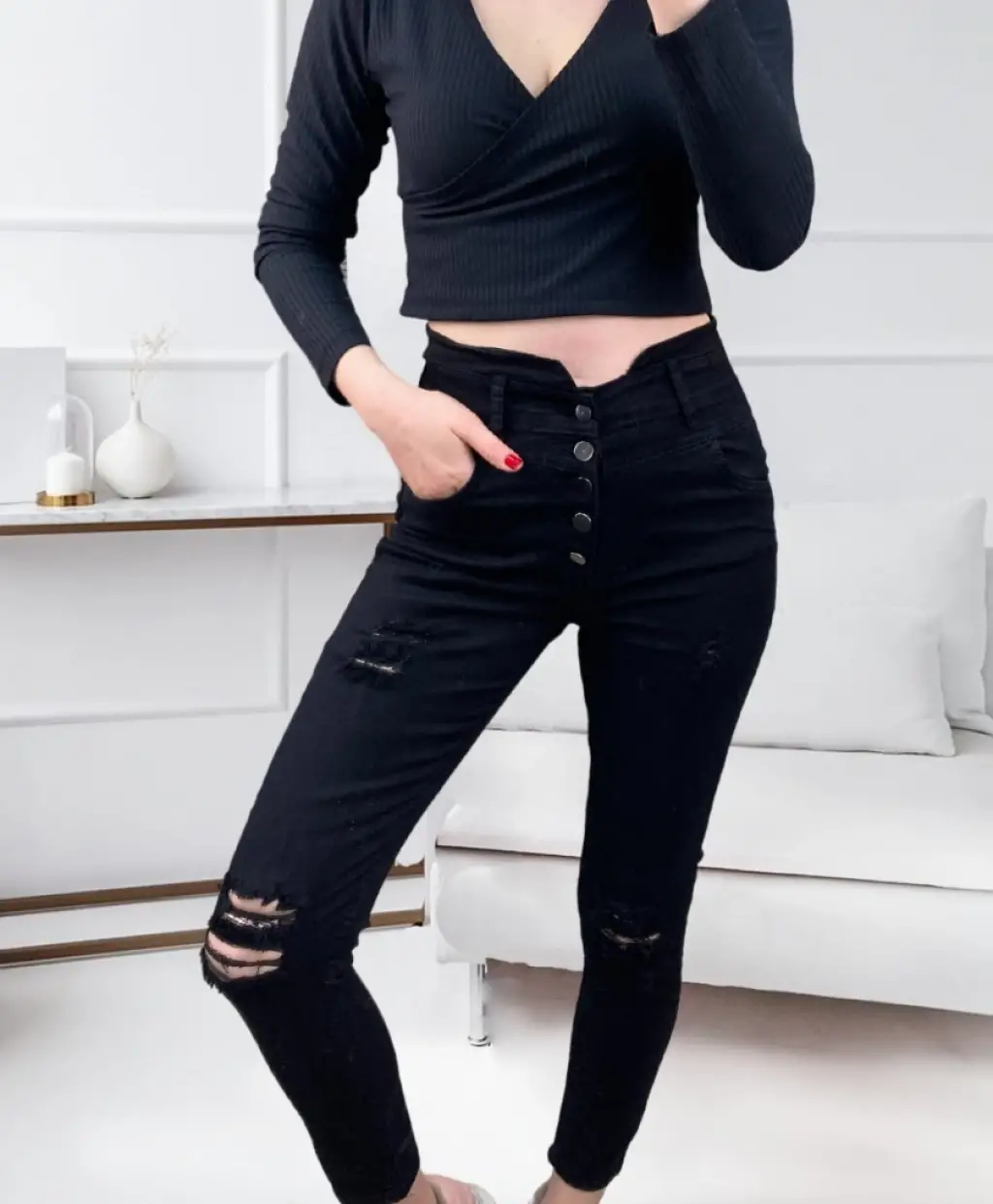 Kadın 5 Düğmeli V Detay Bel Yırtık Kot