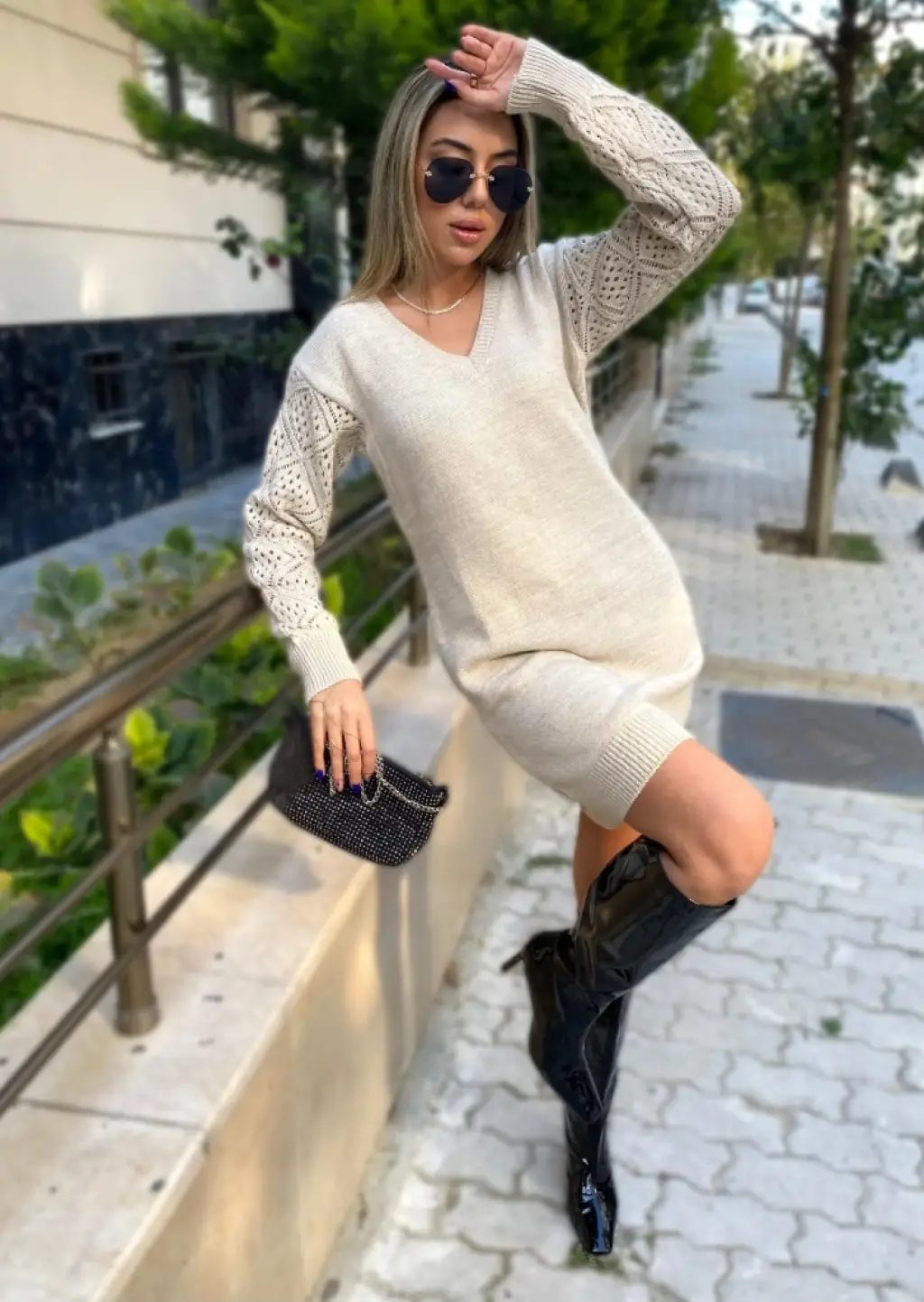 Kadın Uzun Kollu V Yakalı Mini Triko Elbise