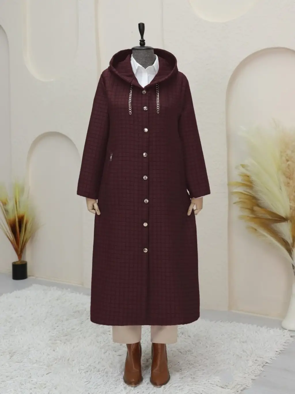 Yakası Zincir Detaylı Uzun Kapitone Kaban -Bordo