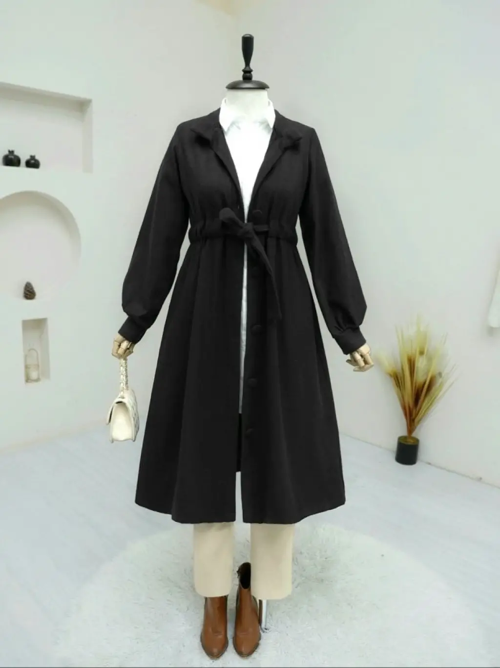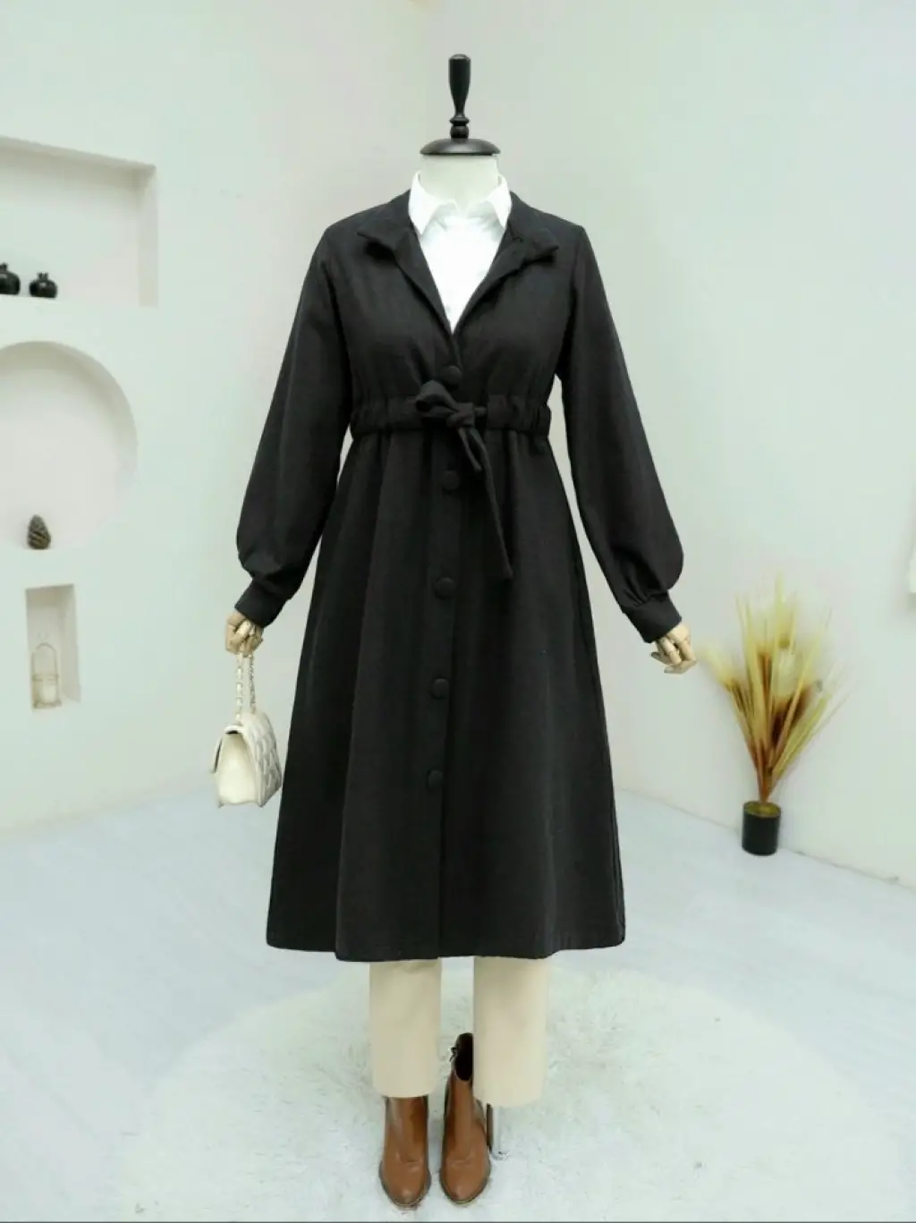 Belden Bağlamalı Top Düğmeli Kaşe Kaban -Siyah