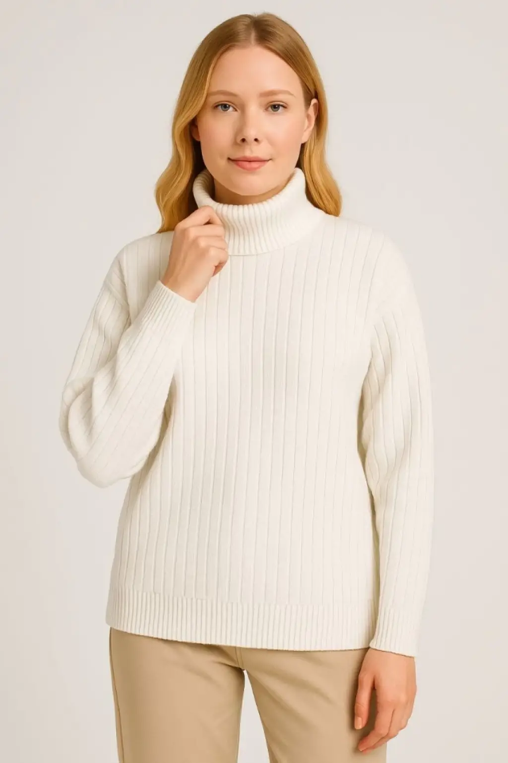 Balıkcı Yaka Bağazlı Triko Kazak Pamuklu Kalın Fitilli Dokuma - Beyaz