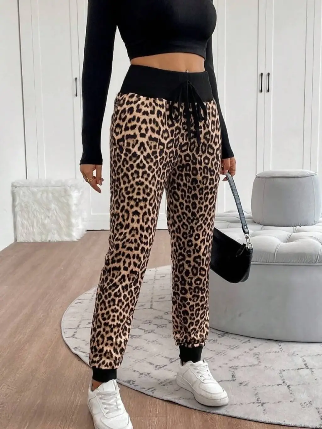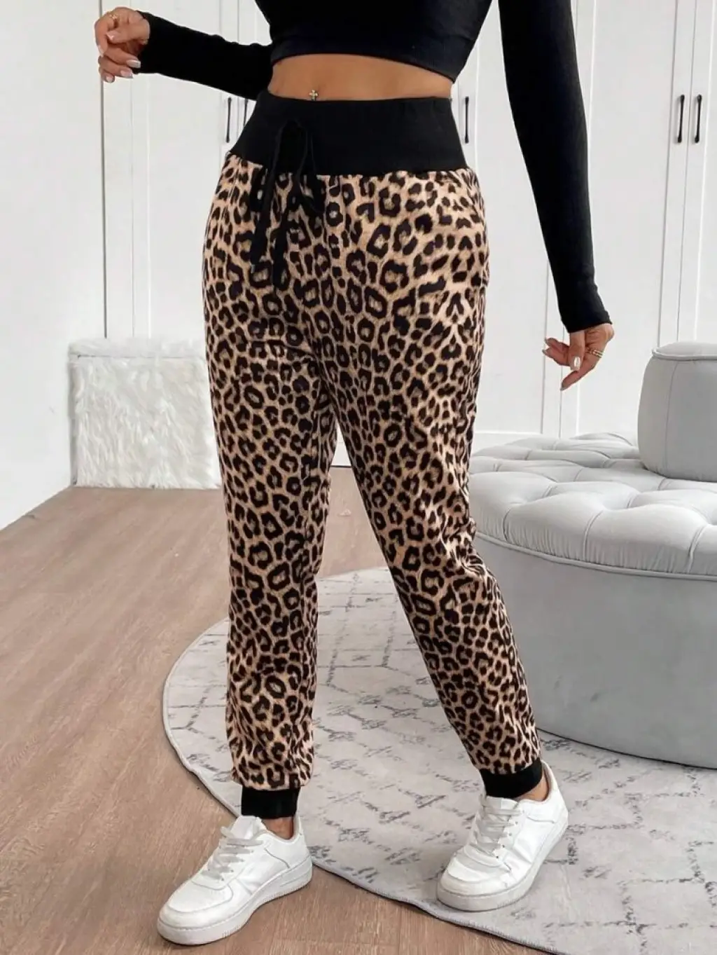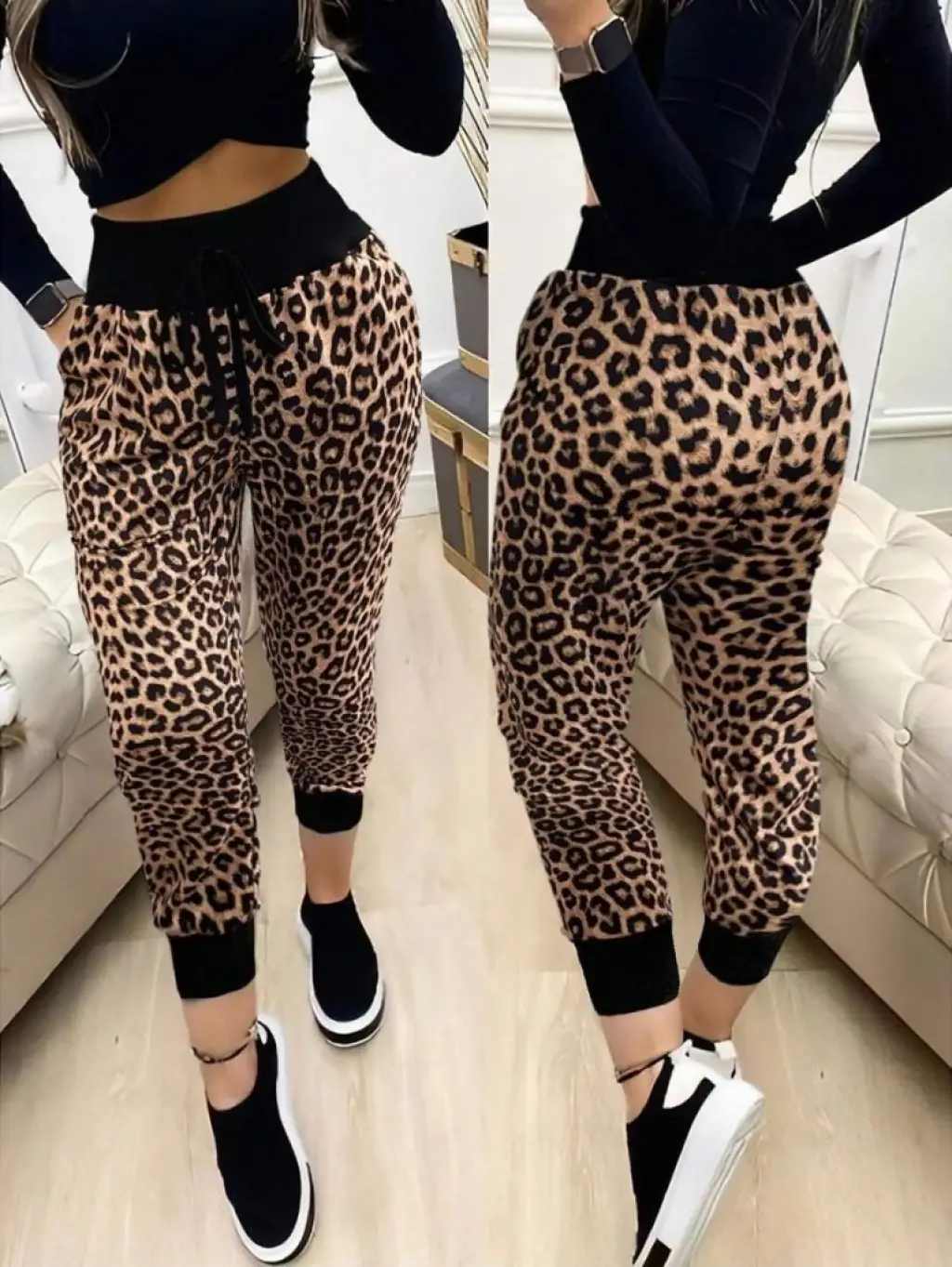 Kadın Yüksek Bel Bağcıklı Yaprak Desenli Süprem Pantolon