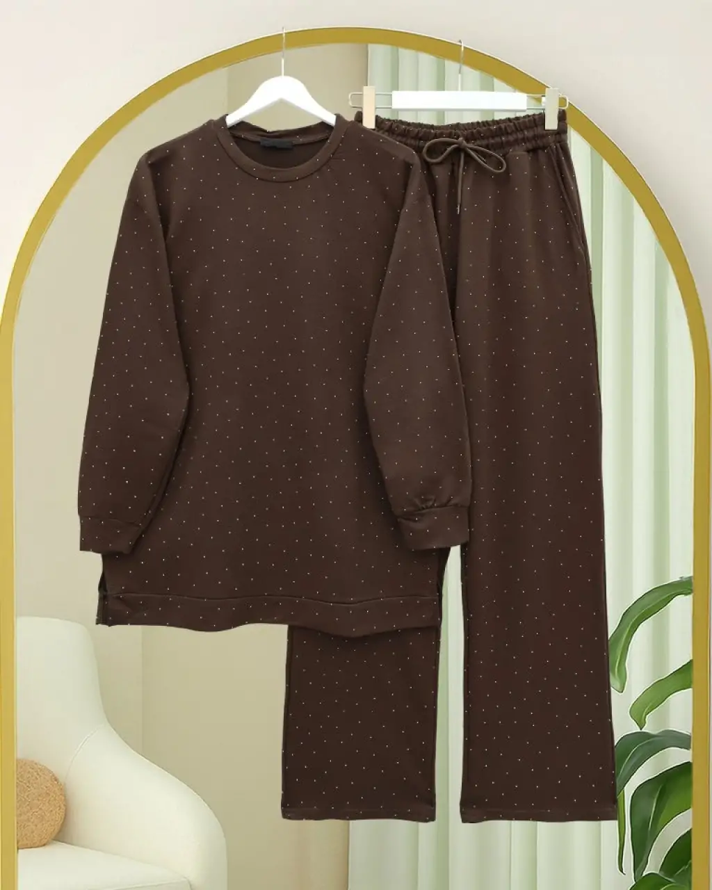 Serpme Taş Detaylı Pantolonlu Benorraho Takım -Kahve