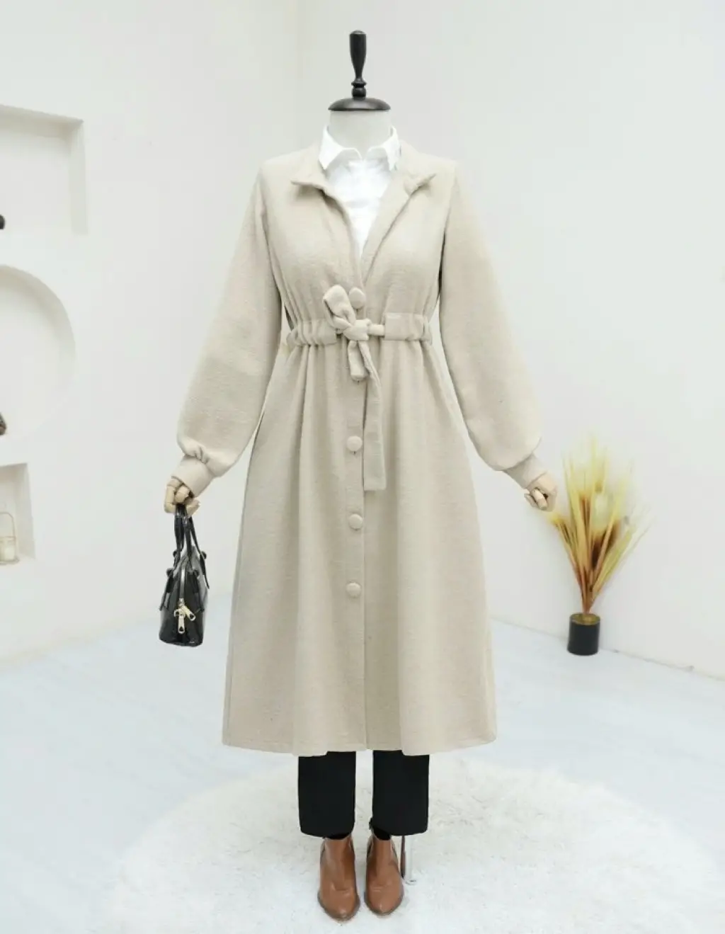 Belden Bağlamalı Top Düğmeli Kaşe Kaban -Bej