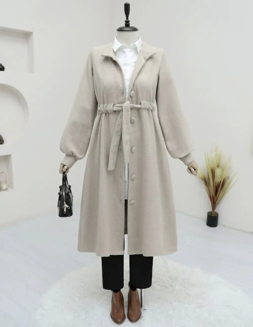 Belden Bağlamalı Top Düğmeli Kaşe Kaban -Taş