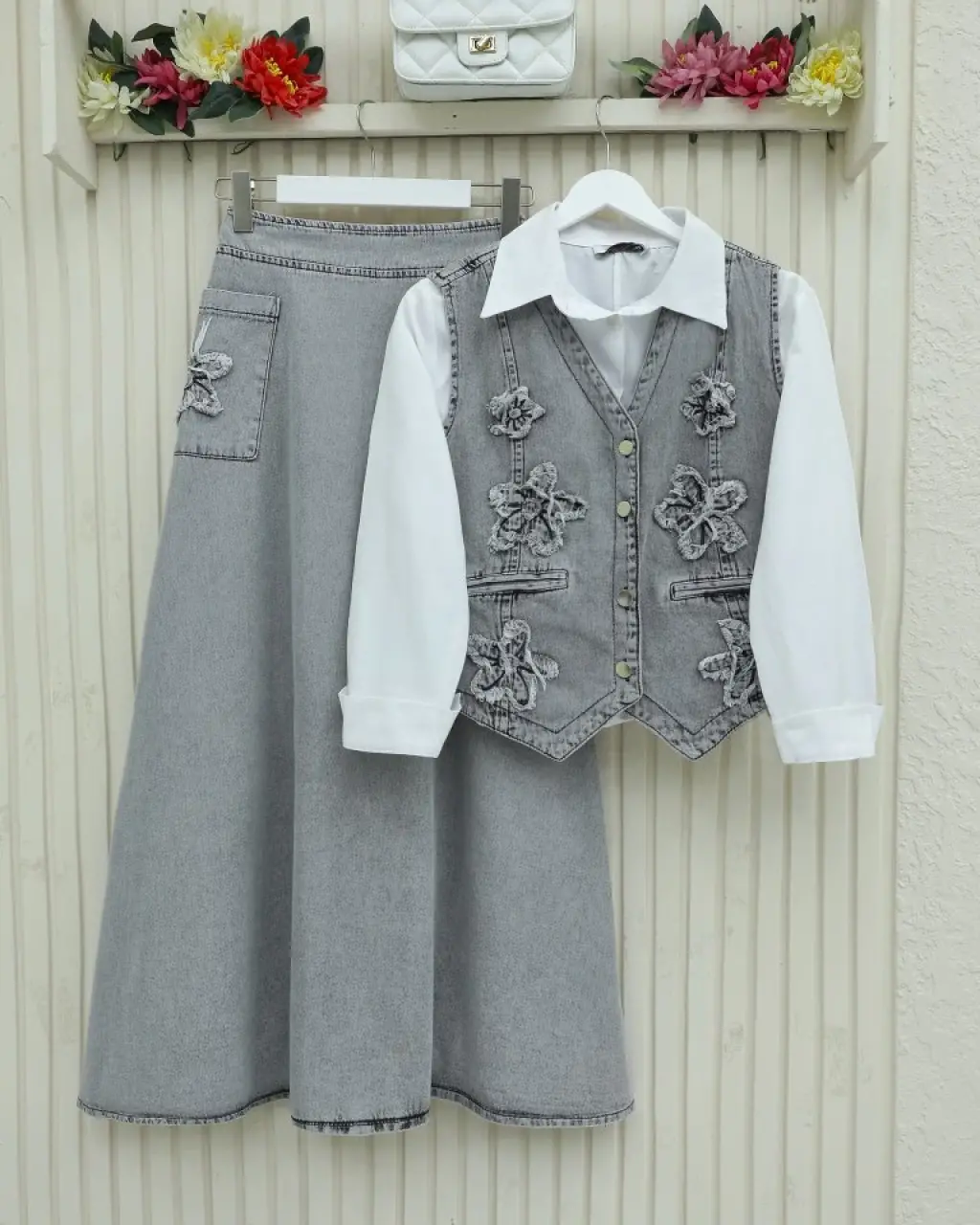 Desenli Etek Beli Lastikli Yelek Etek Kot Takım -Gri