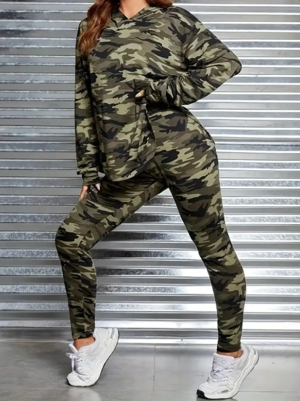 Kadın Uzun Kollu Kapşonlu Kamuflaj Desenli Bluz Ve Pantolon Tayt Ikili Takım