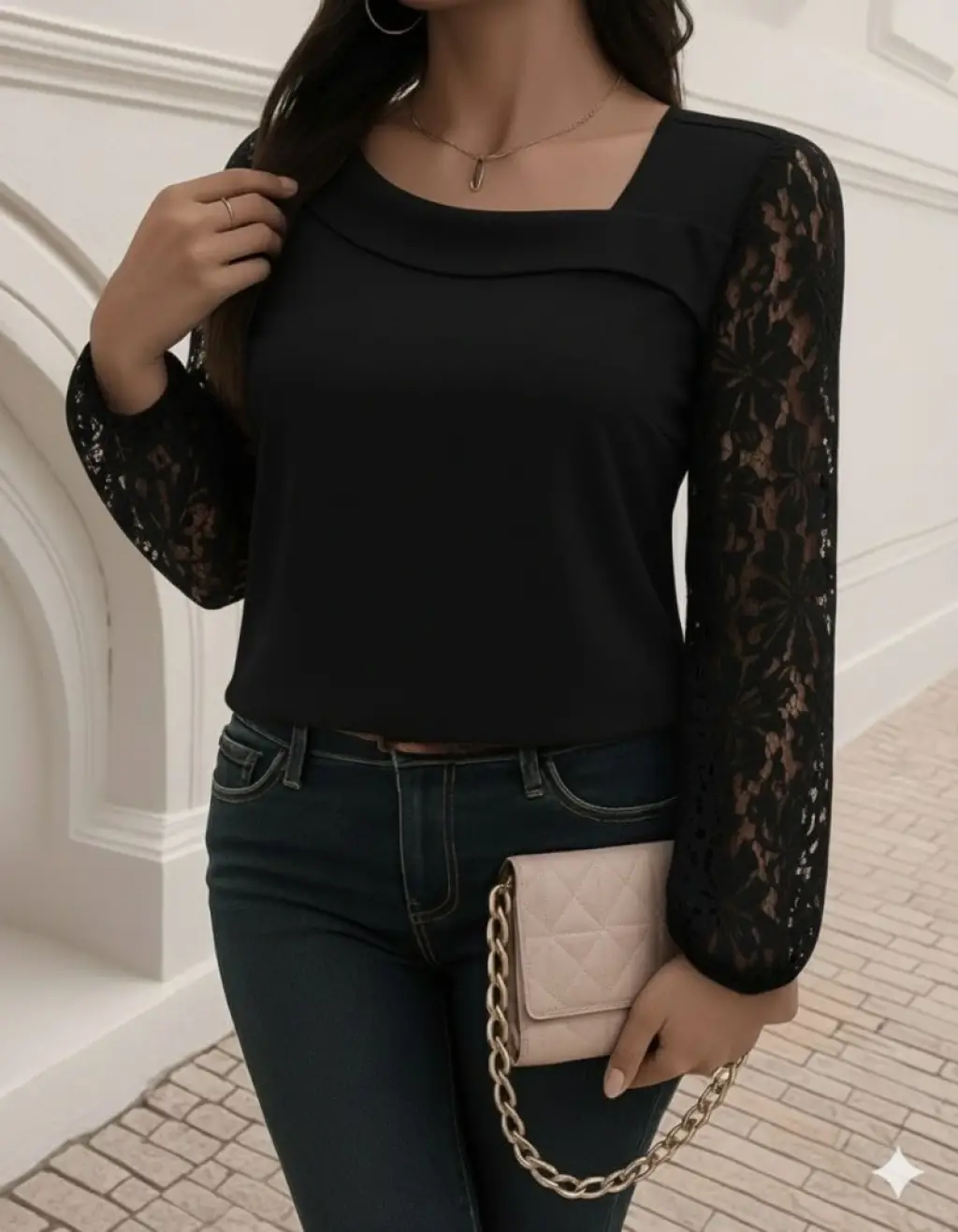Kadın Uzun Kollu Asimetrik Yakalı Dantelli Ithal Krep Bluz