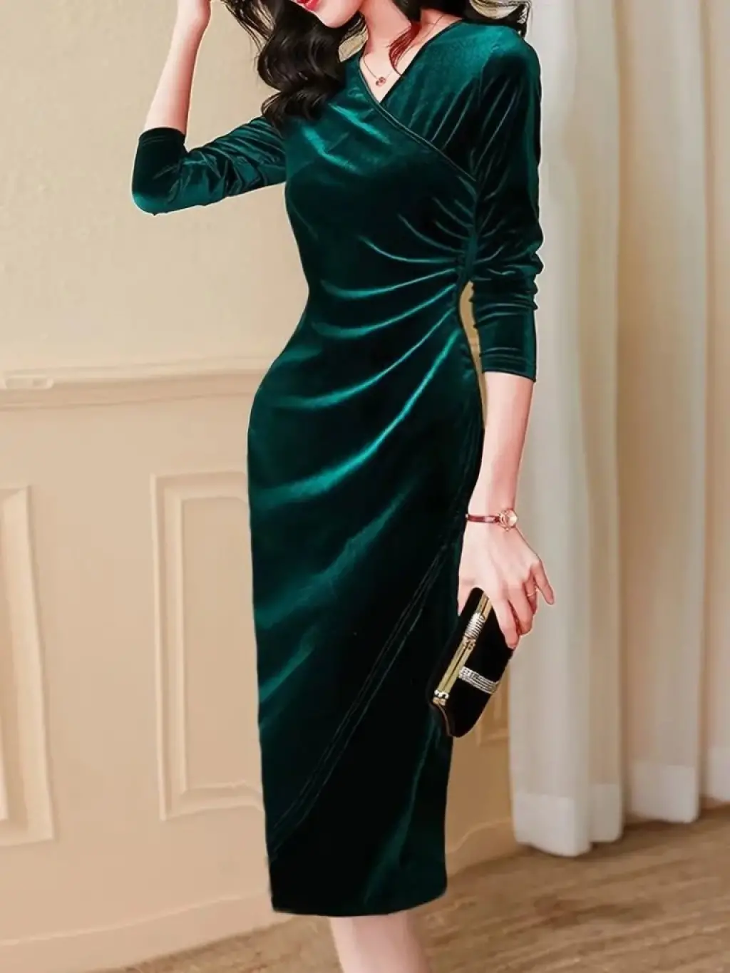 Kadın Uzun Kollu Kruvaze Yakalı Yandan Büzgülü önden çapraz Detaylı Midi Kadife Elbise