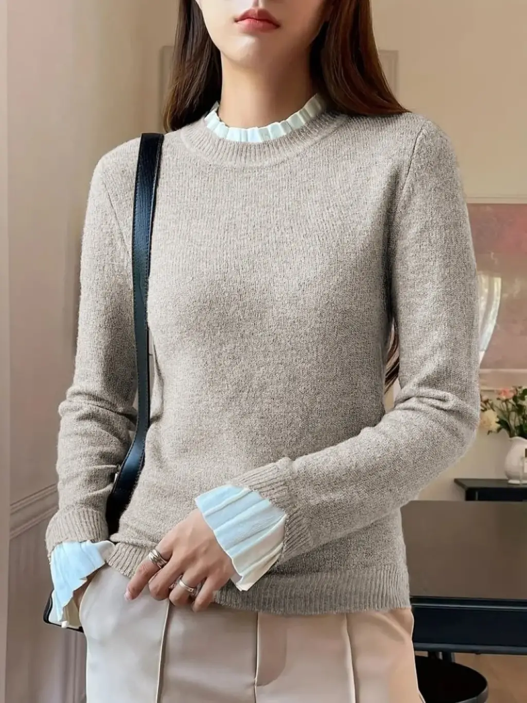 Kadın Uzun Kollu Fırfırlı Yakalı Triko Krem Bluz