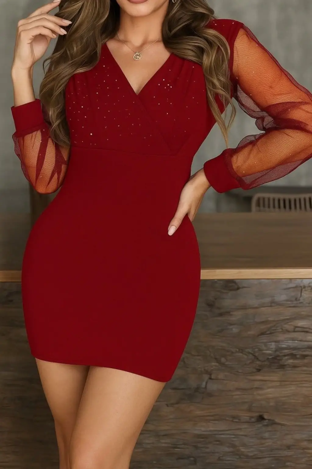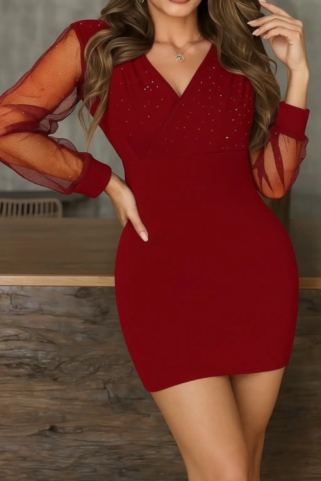 Kadın Uzun Kollu V Yakalı Taşlı Mini Ithal Krep Elbise