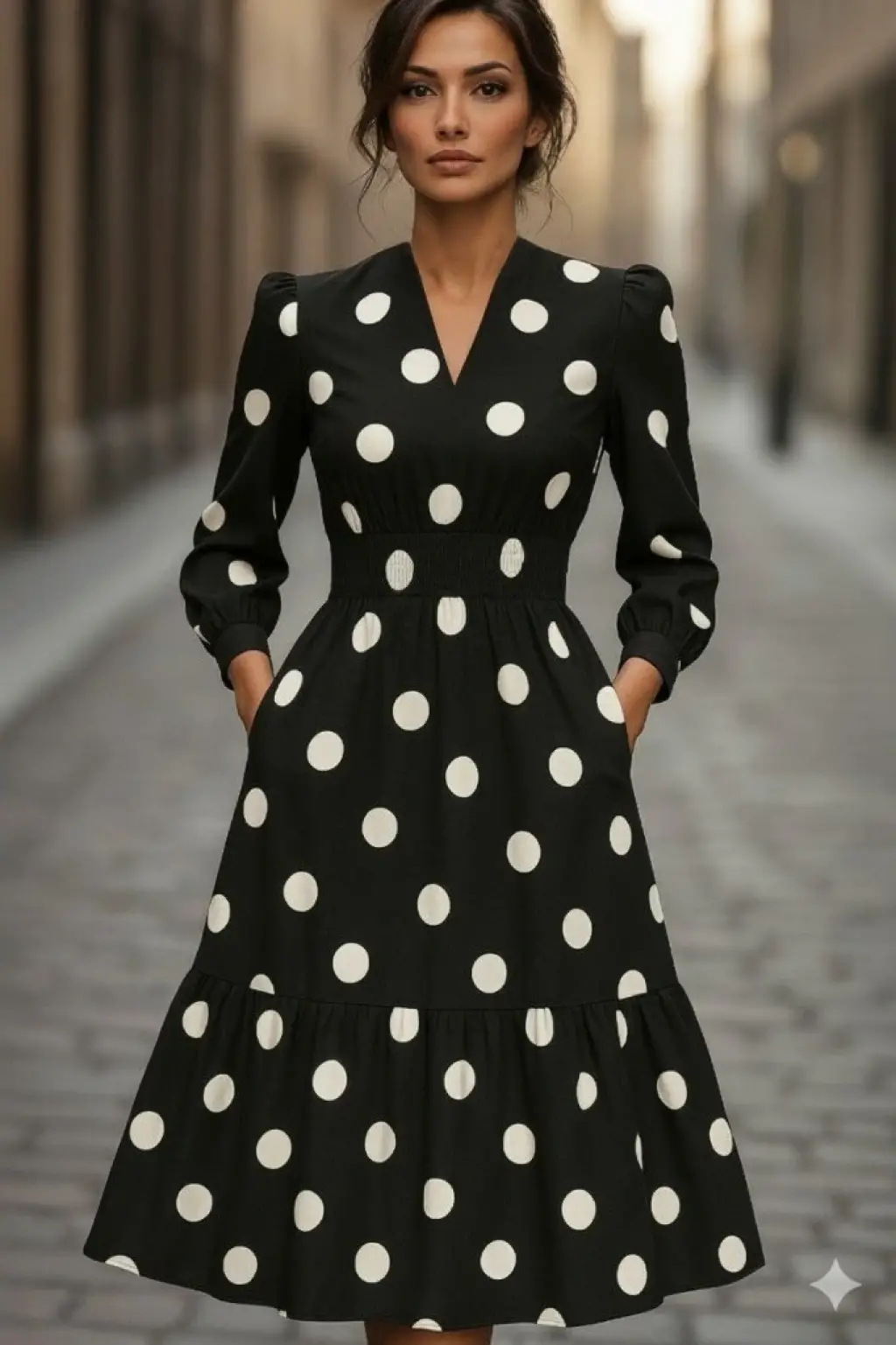 Kadın Uzun Kollu V Yakalı Beli Lastikli Puantiyeli Uzun Krep Elbise