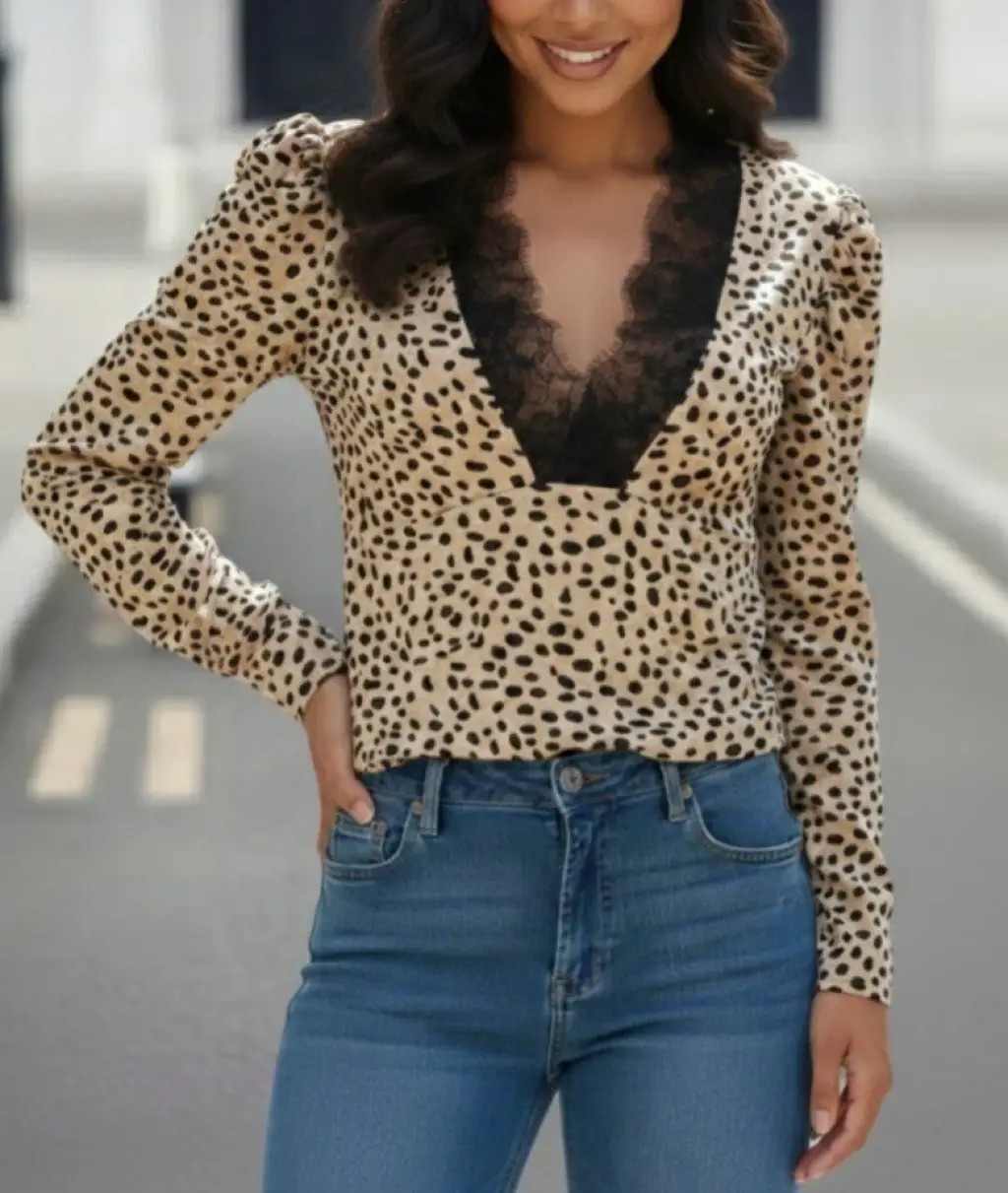 Kadın Uzun Kollu önden Derin Dantel Yaka Leopar Desenli Dalgıç Bluz