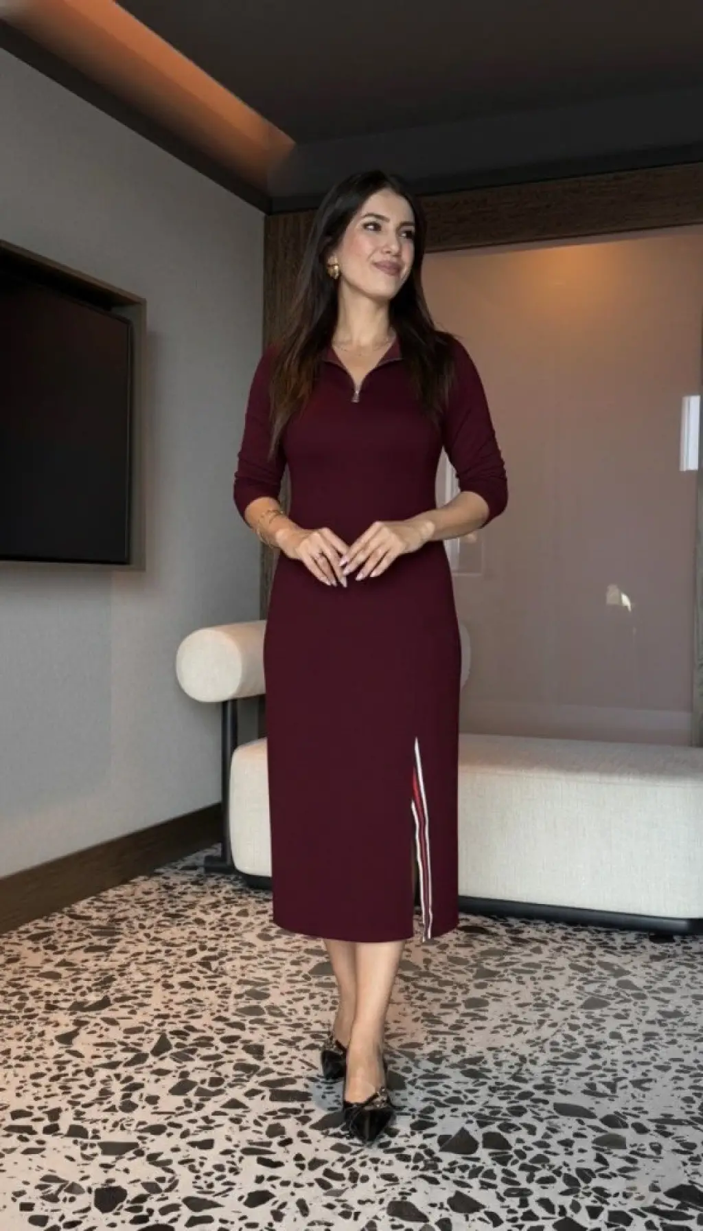 Kadın Uzun Kollu Balıkçı Yaka önden Fermuarlı Yırtmaçlı Midi Viskon Iki Iplik Elbise