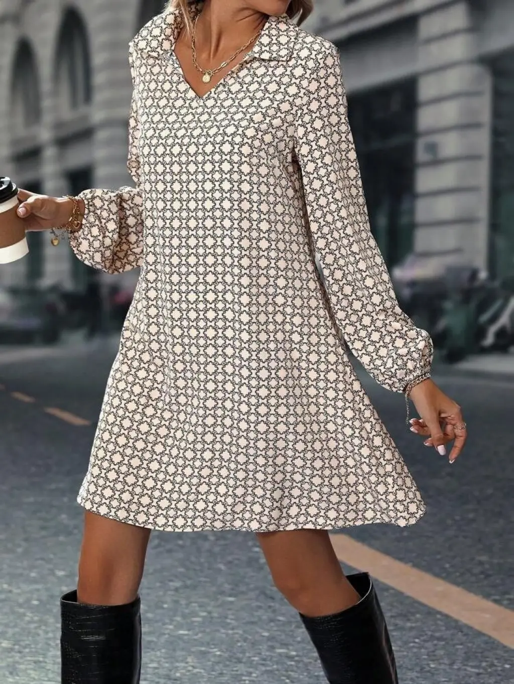 Kadın Uzun Kollu Yakalı Desenli Mini Modal Elbise