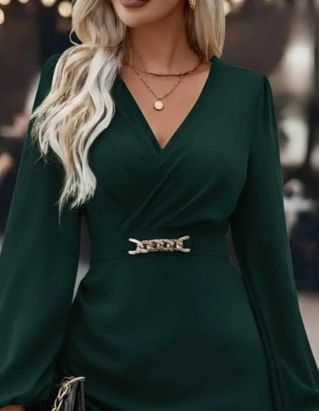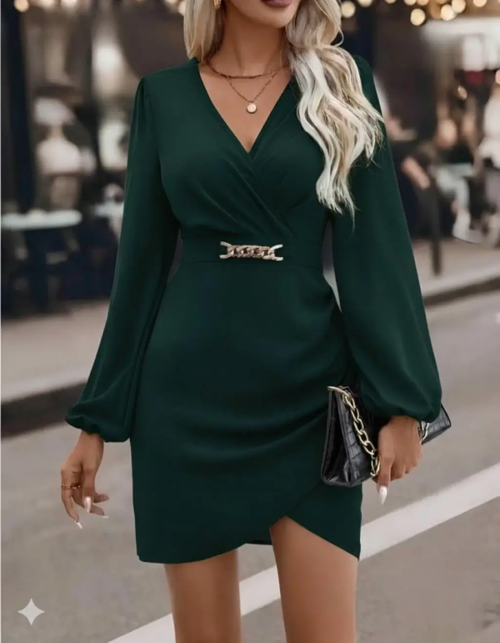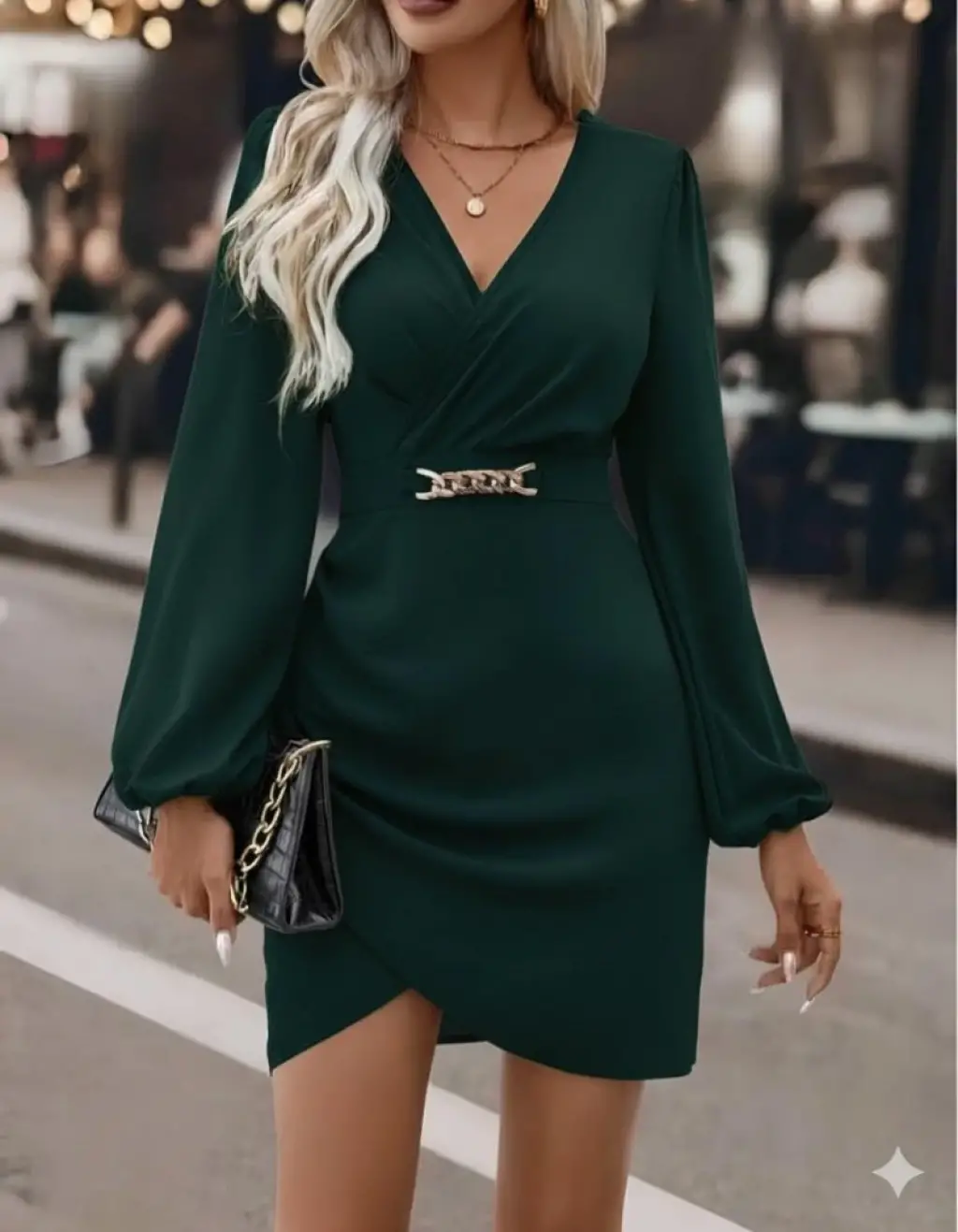 Kadın Uzun Kollu Kruvaze Yakalı Belden Kuşaklı Mini çift Katlı Ithal Krep Elbise