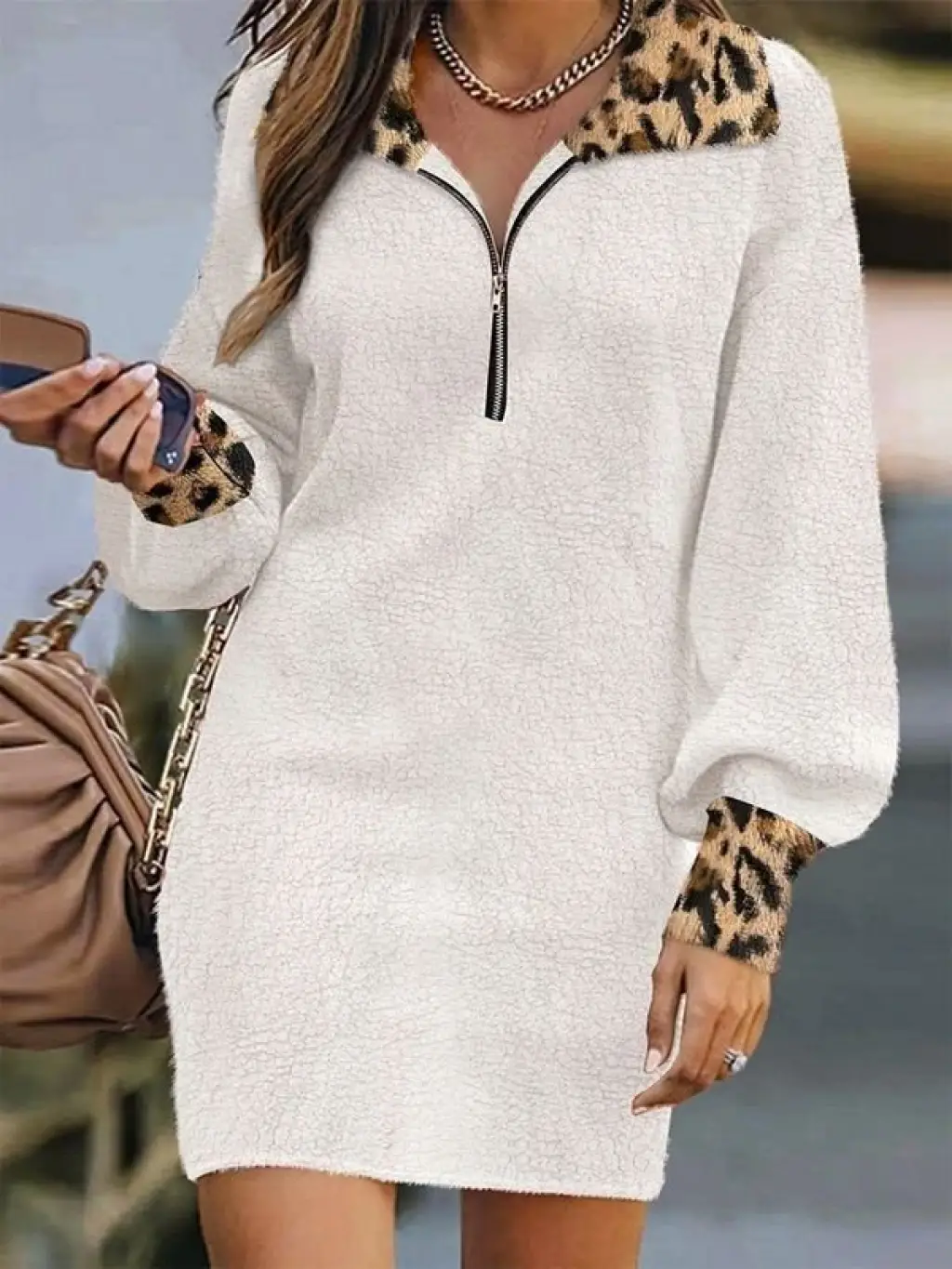 Kadın Uzun Kollu Yakalı önden Fermuarlı Leopar Detaylı Mini Peluş Elbise