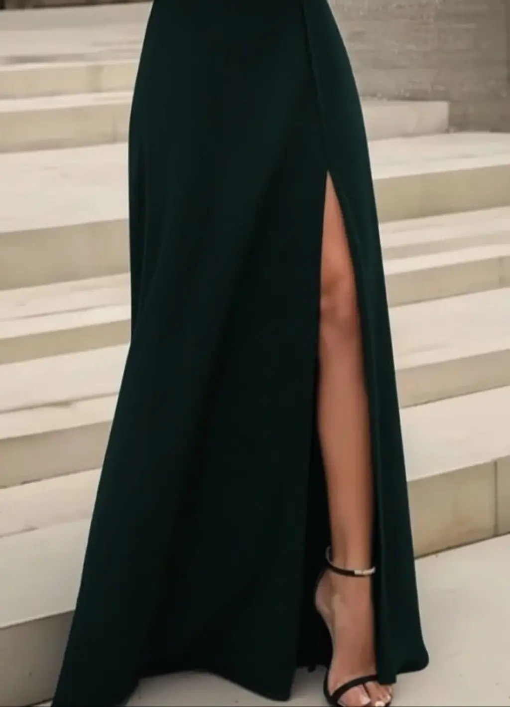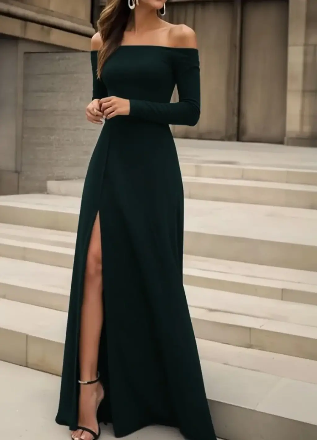 Kadın Uzun Kollu Madonna Yakalı Yırtmaç Detaylı Uzun Ithal Krep Elbise