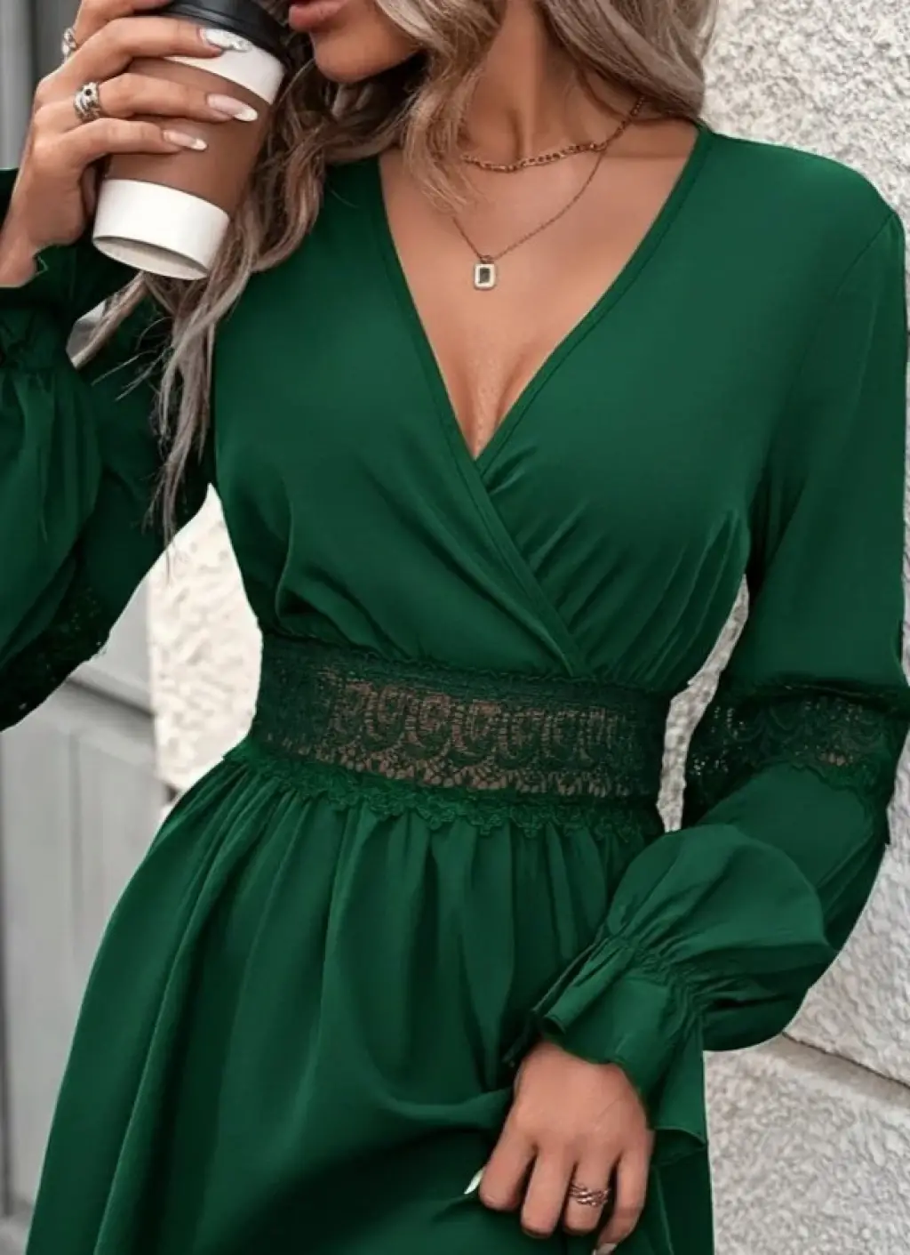 Kadın Uzun Kollu Kruvaze Yakalı Dantelli Fermuar Detaylı Mini Ithal Krep Elbise