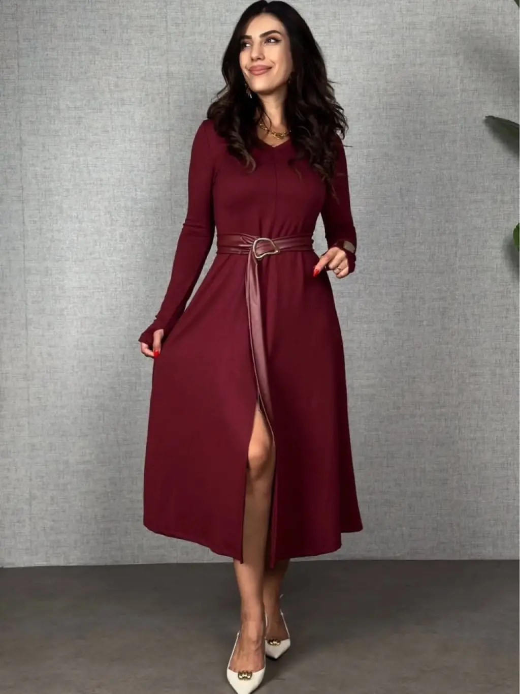 Kadın Uzun Kollu Yakalı Belden Deri Detaylı Kuşaklı Yırtmaçlı Midi Viskon Iki Iplik Elbise