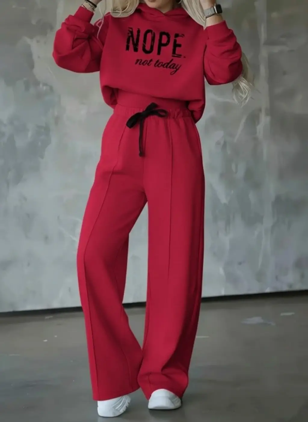 Kadın Uzun Kollu Kapşonlu Bağcıklı Desenli Iki Iplik Bluz Ve Pantolon Ikili Takım