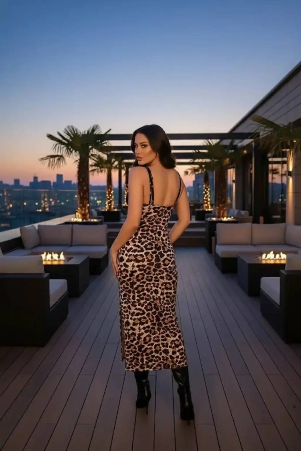 Kadın Dantel Detay Omuz Askılı Leopar Desen Maxi Yırtmaçlı Gloplu Elbise