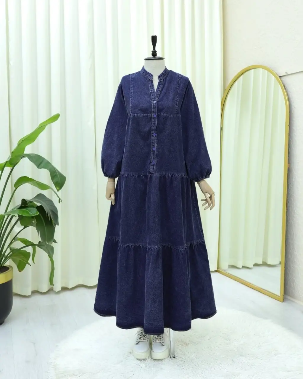 Yarım Düğmeli Kolu Lastikli Yarasa Kol Kot Elbise -Laci