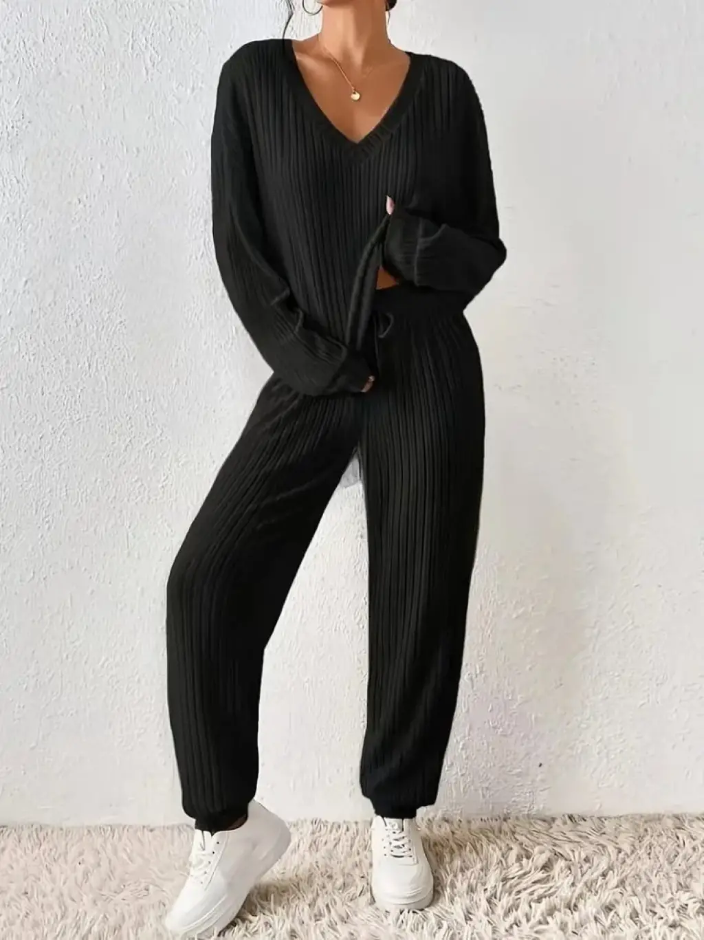 Kadın Uzun Kollu V Yakalı Kaşkorse Bluz Ve Pantolon Ikili Takım