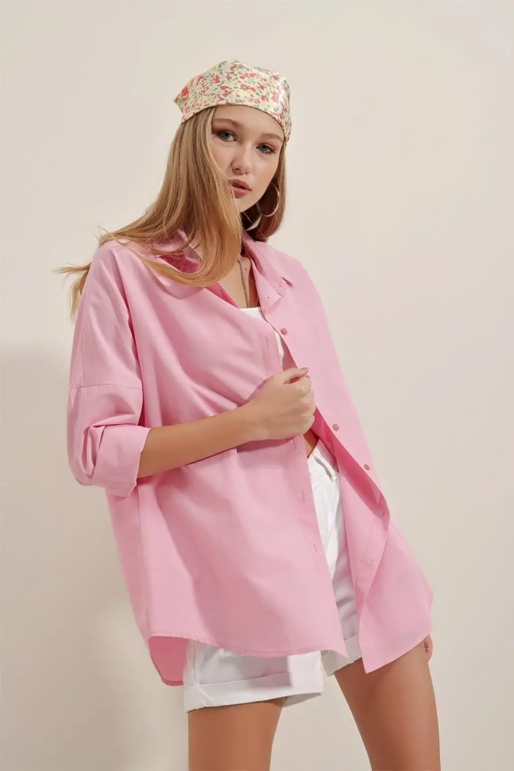 3900 Oversize Uzun Basic Gömlek - Pembe