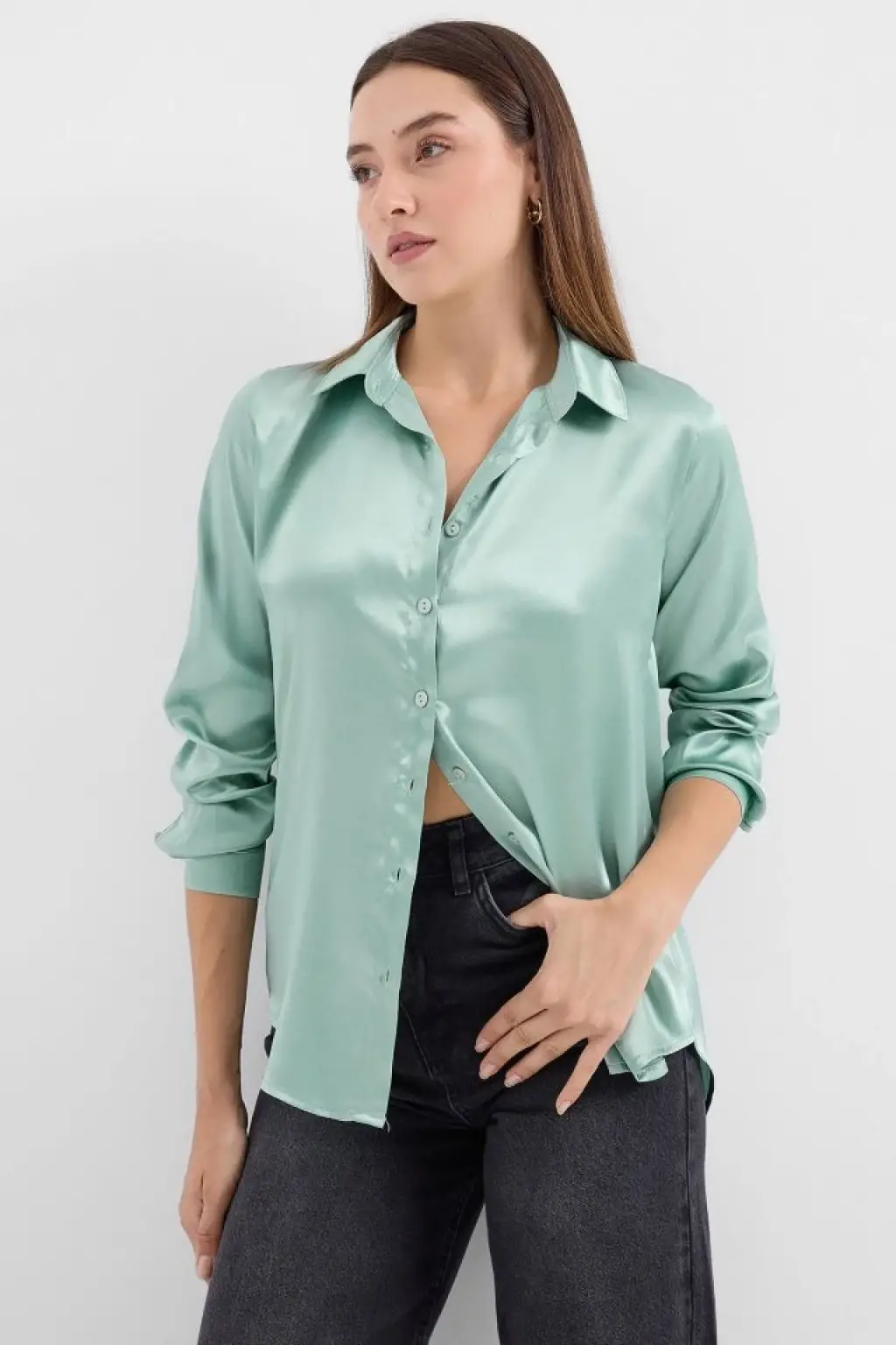 3964 Hafif Dökümlü Saten Gömlek - Çağla
