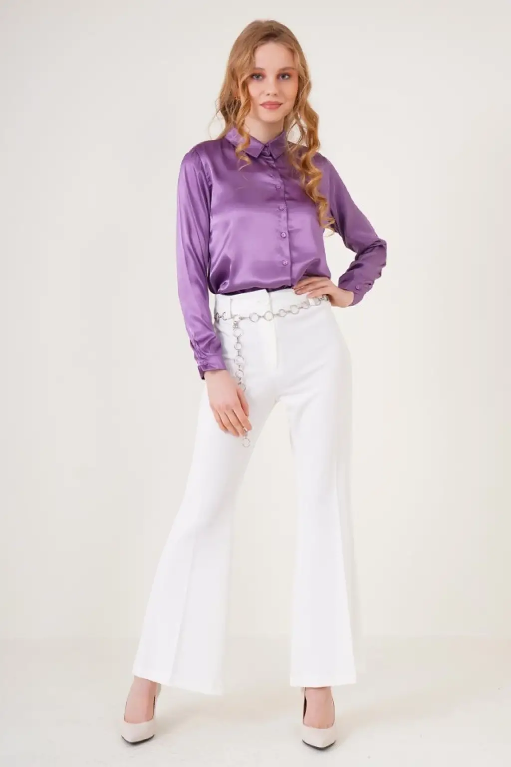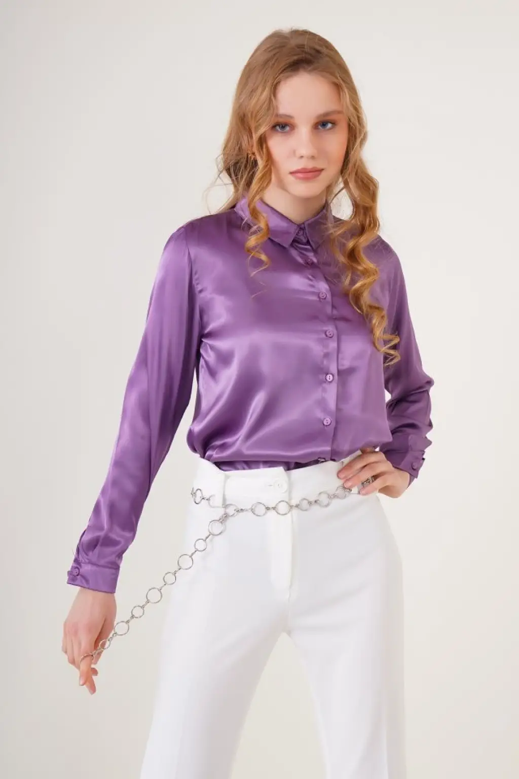 3964 Hafif Dökümlü Saten Gömlek - Mor