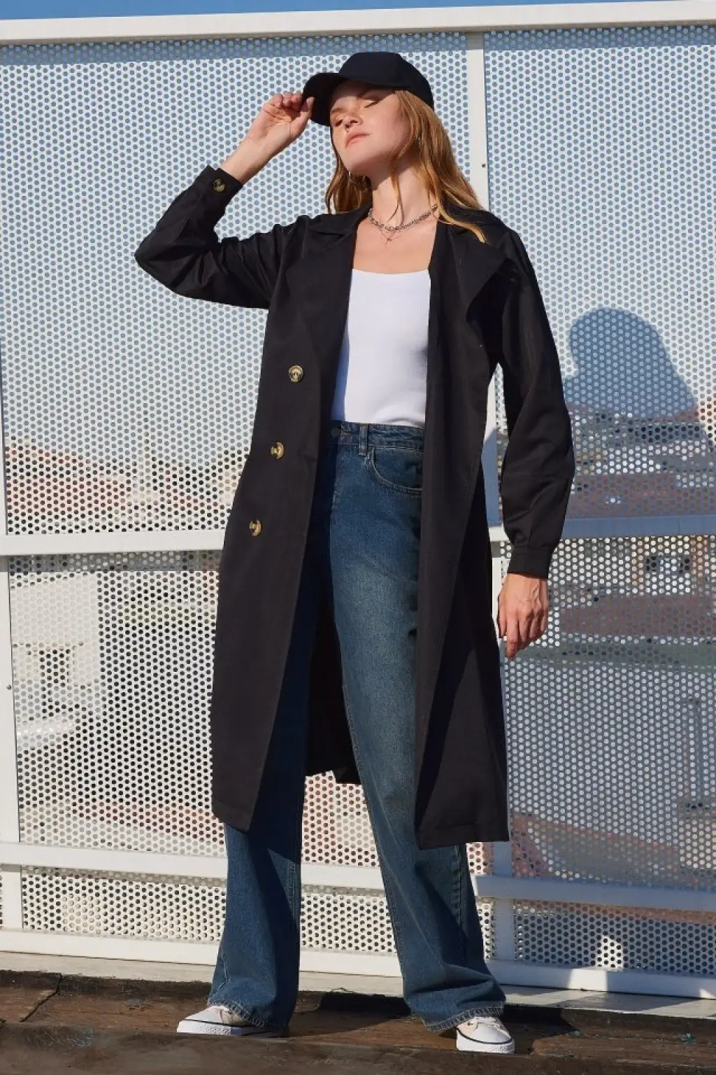 Düğmeli Kemerli Ara Boy Trençkot -Taba