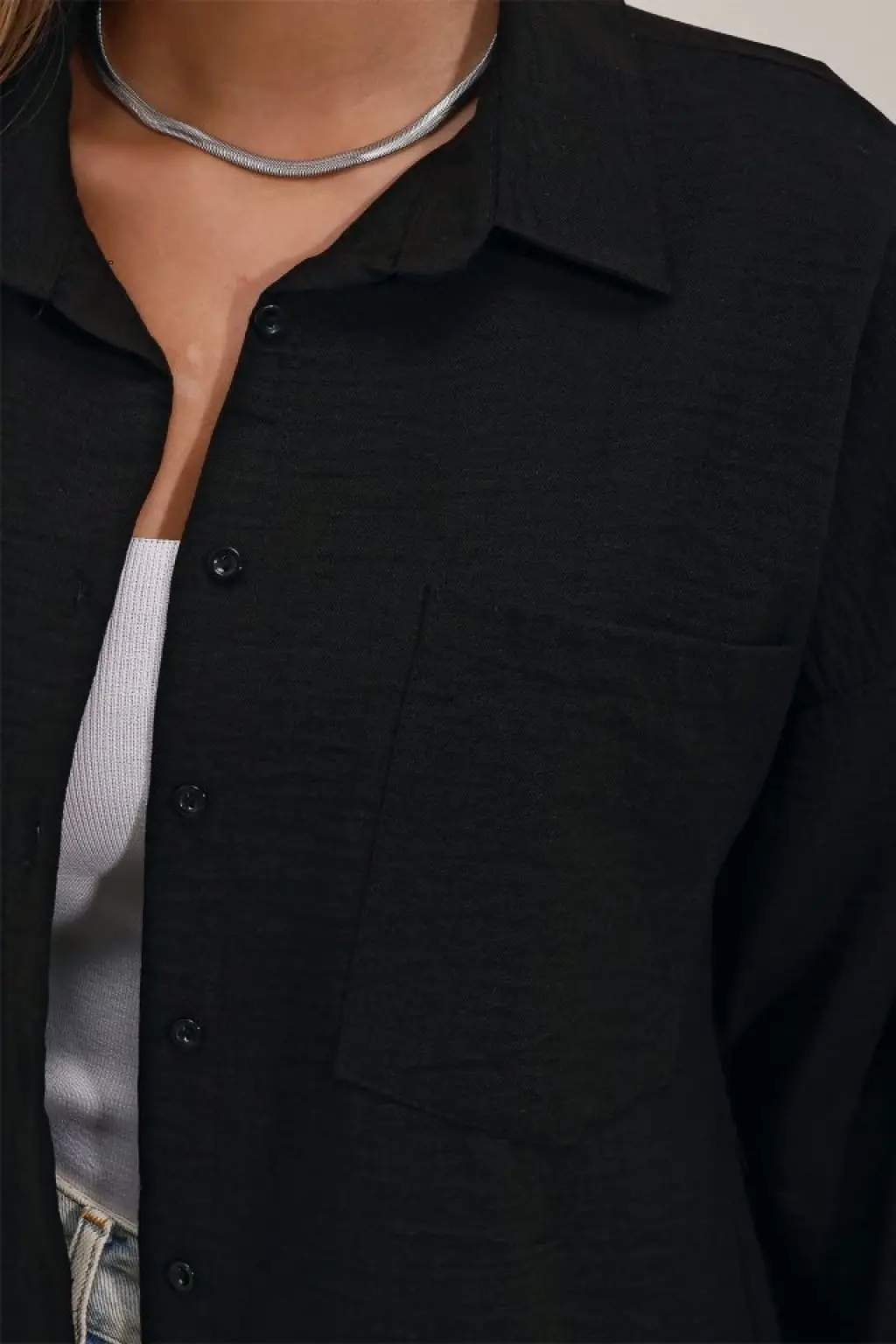 20153 Tek Cepli Oversize Keten Gömlek - Siyah