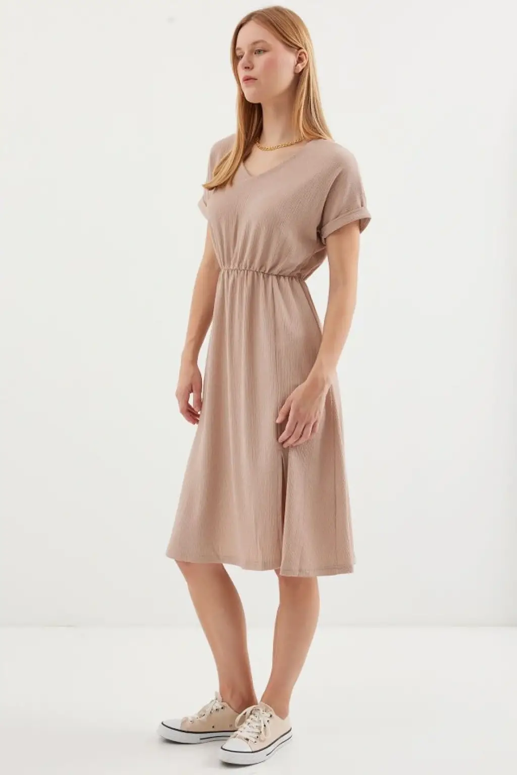 2378 V Yaka Yırtmaçlı Örme Elbise - Bisküvi