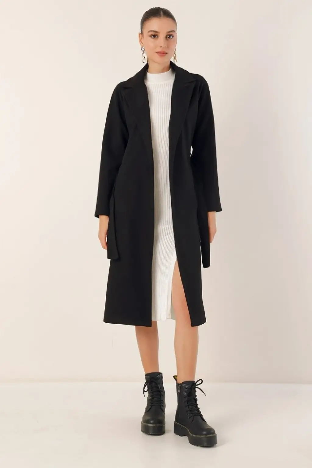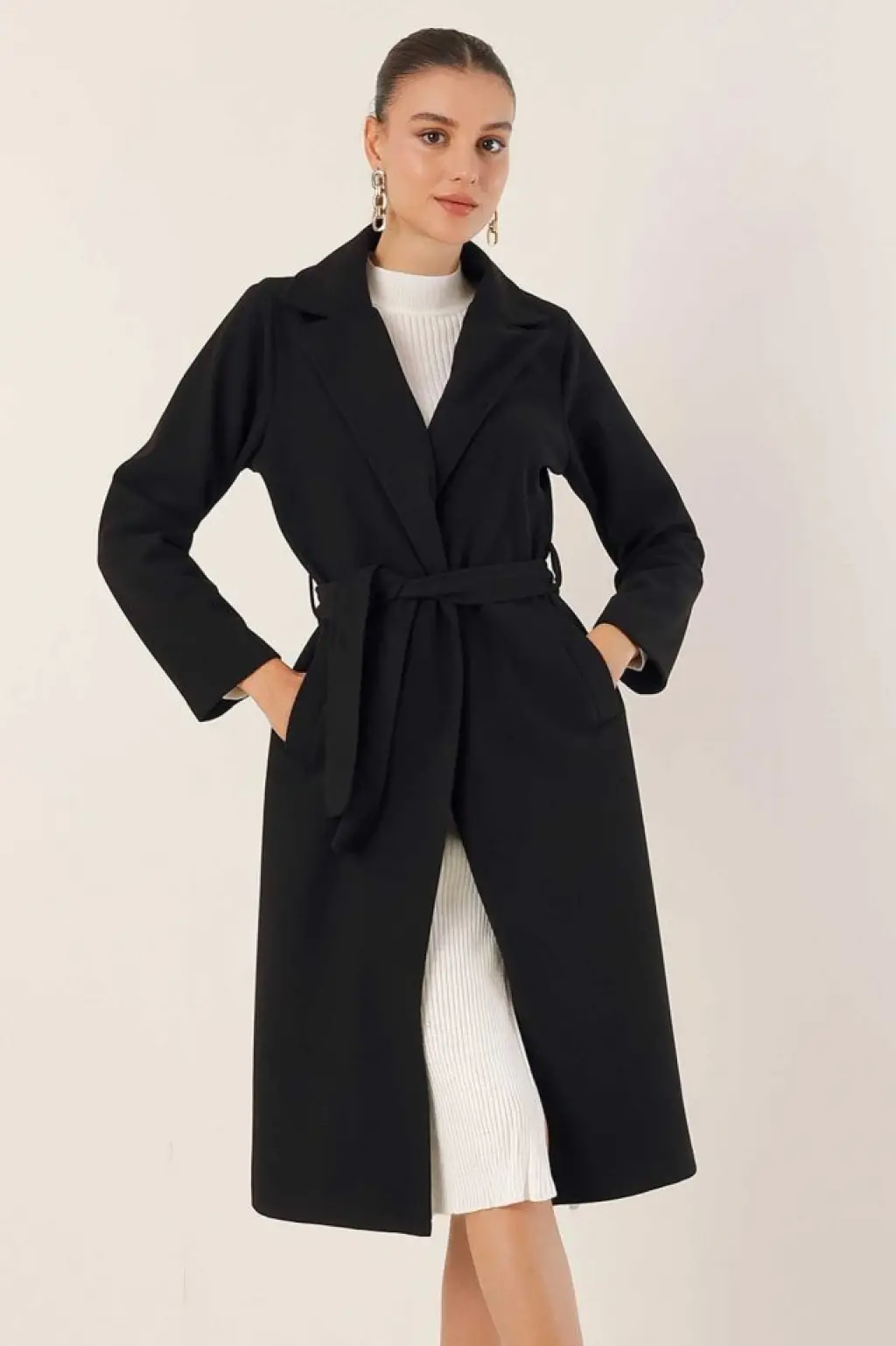 Sabit Kapşonlu Kuş Gözü Detaylı Uzun Kaban -Siyah