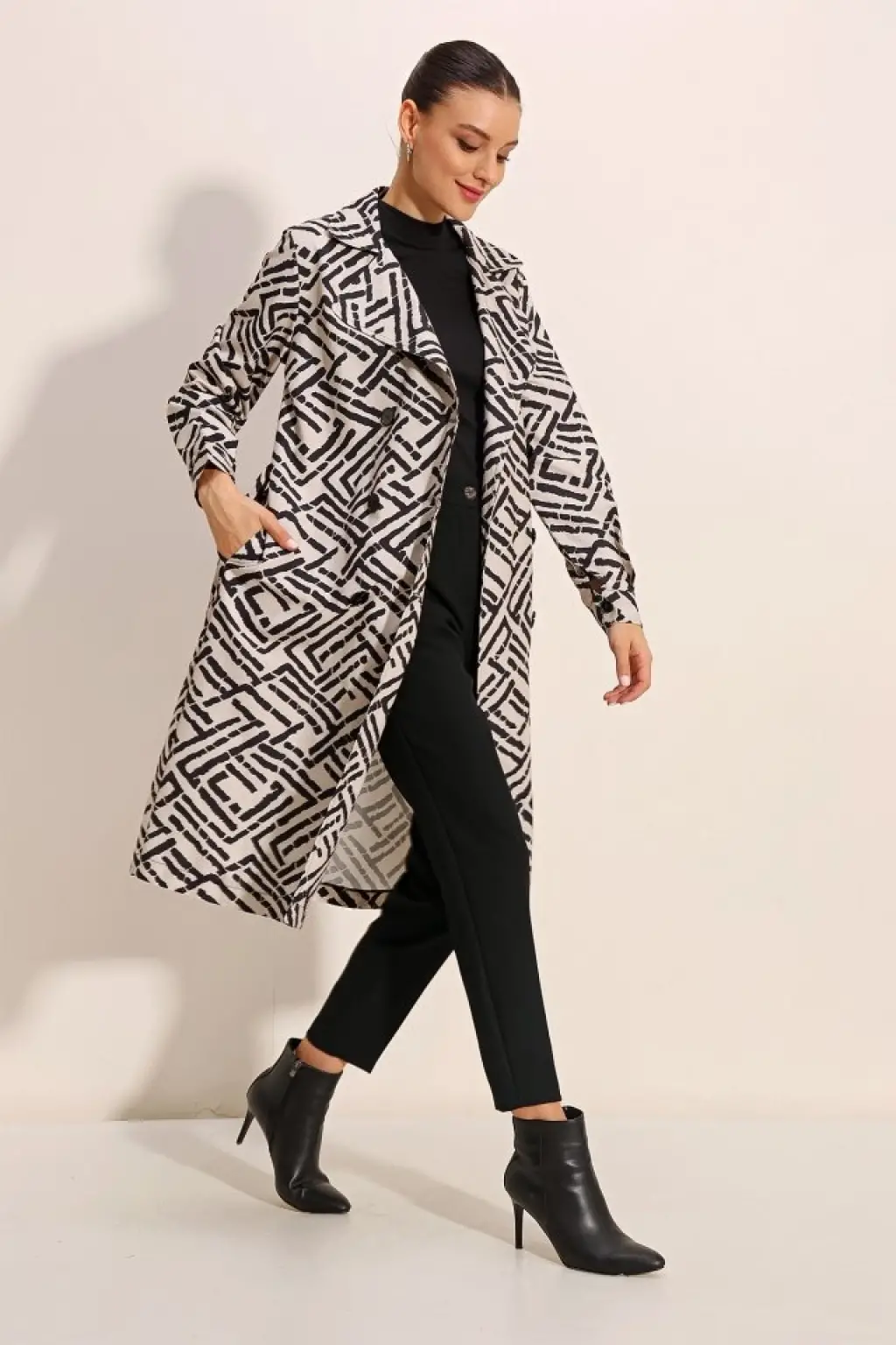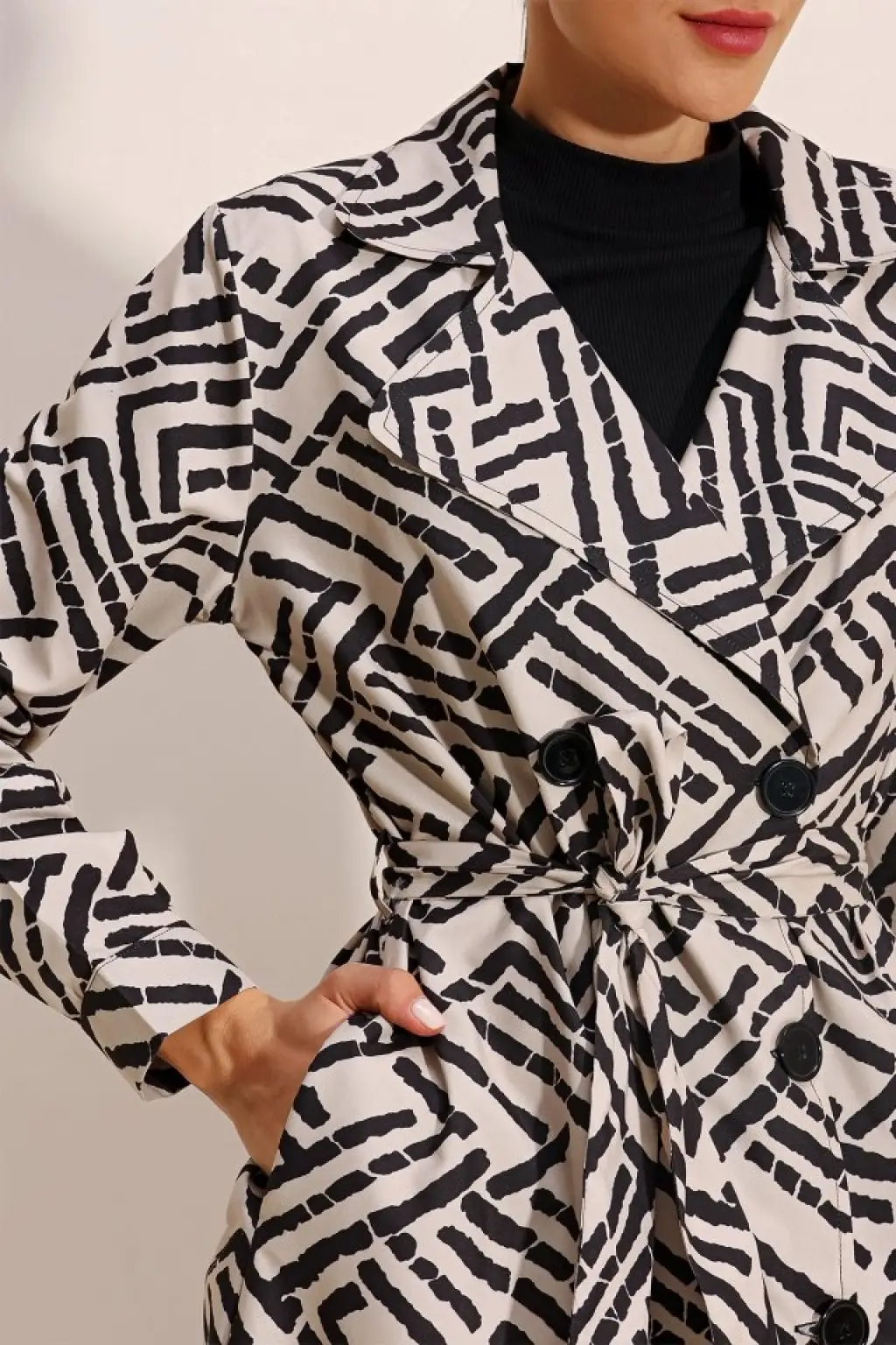 5853 Desenli Kruvaze Yaka Trençkot - C.Beyaz
