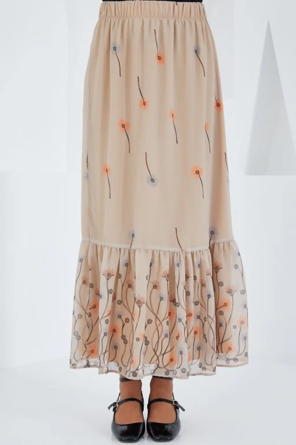 Krem Desenli Şifon Etek 8010