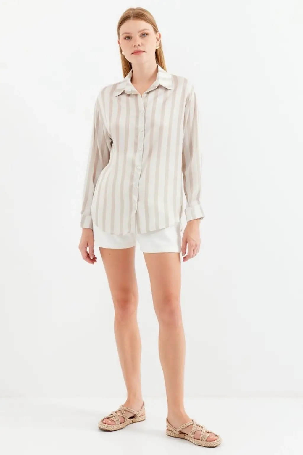 Çizgili Oversize Gömlek 20293 - Kahverengi