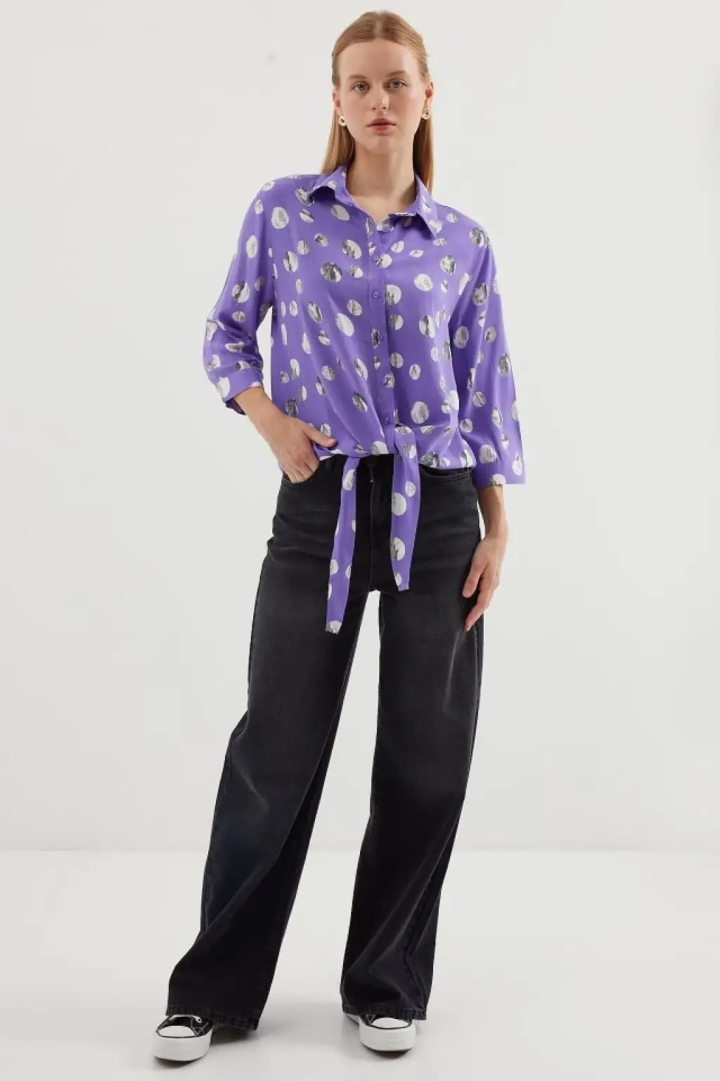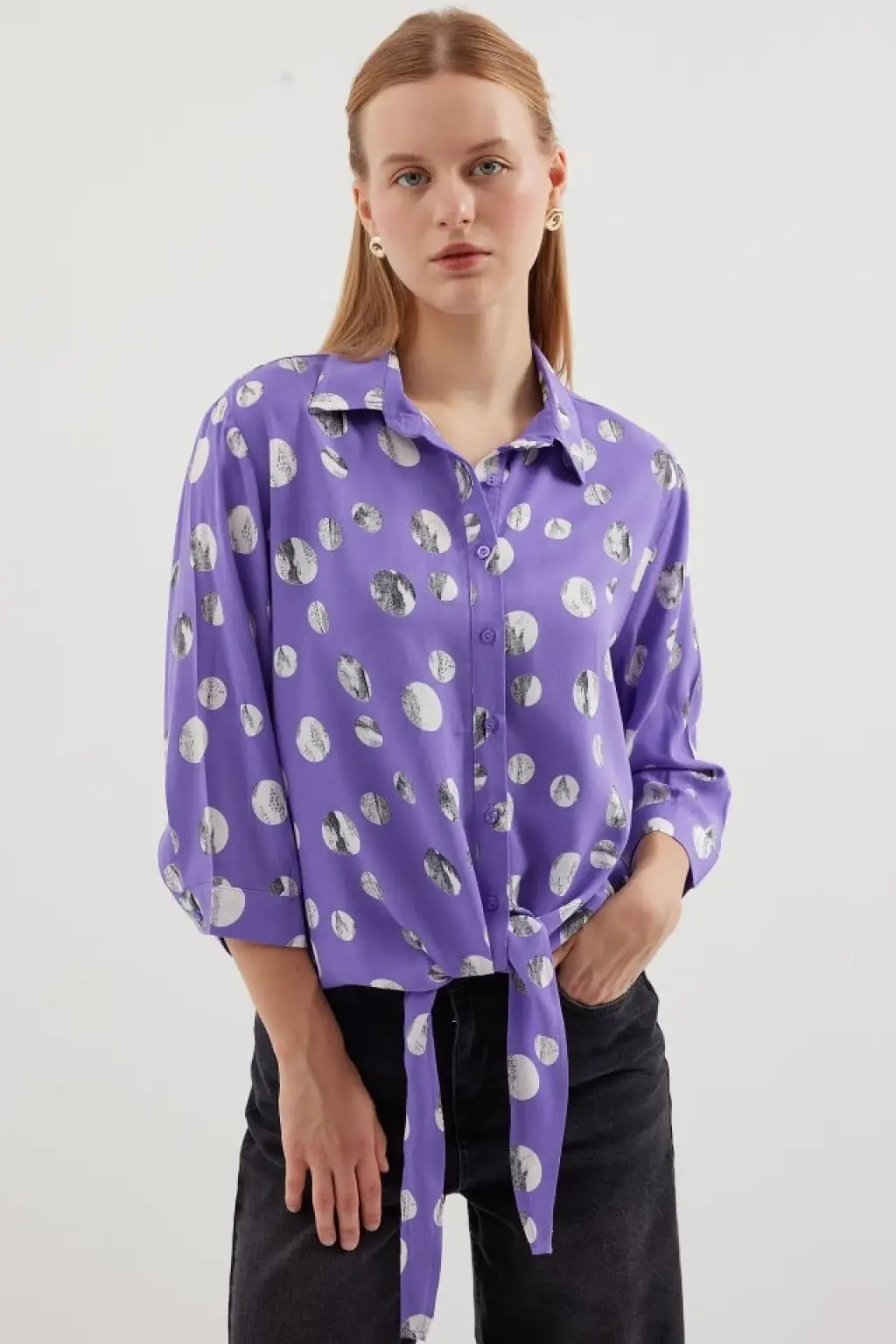 20243 Önü Bağlamalı Desenli Gömlek - Lila