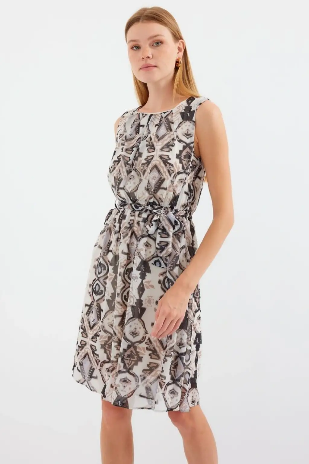 2501 Desenli Sıfır Kol Şifon Elbise - Siyah