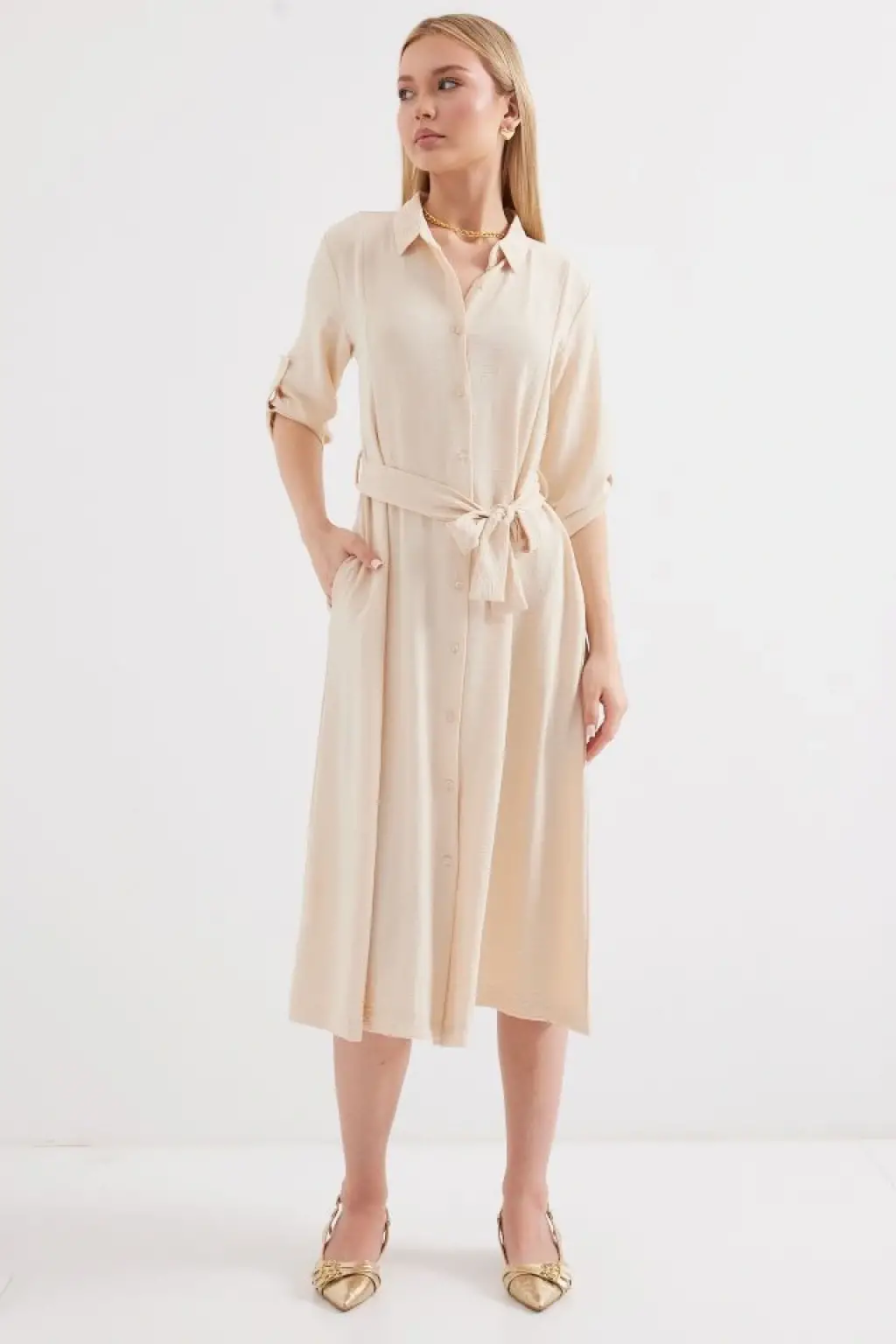 2442 Kuşaklı Gömlek Elbise - Krem